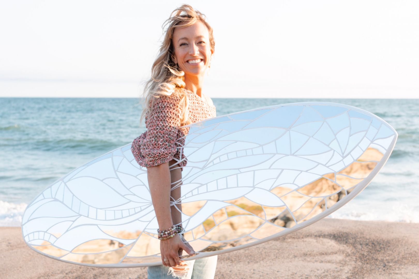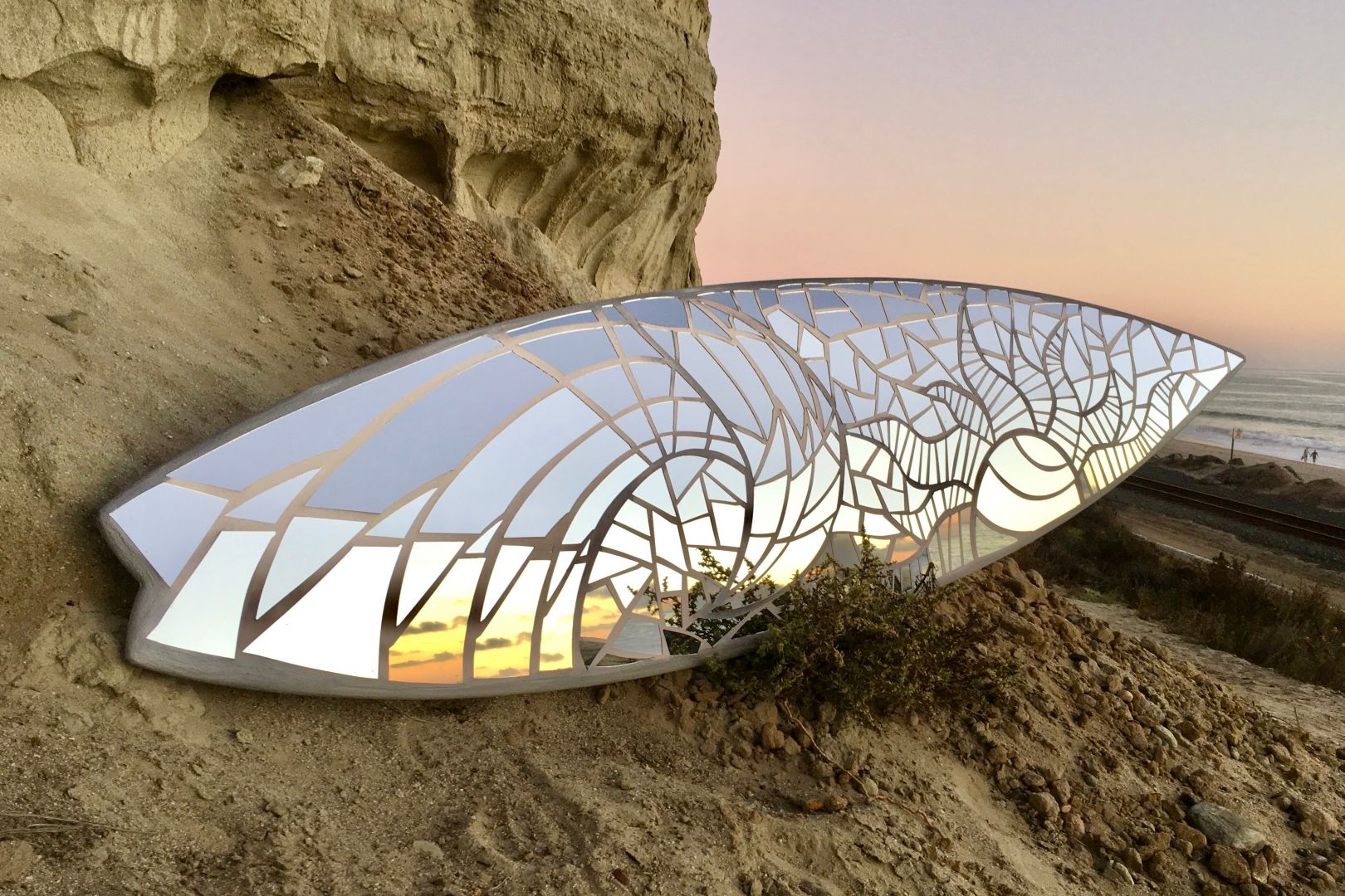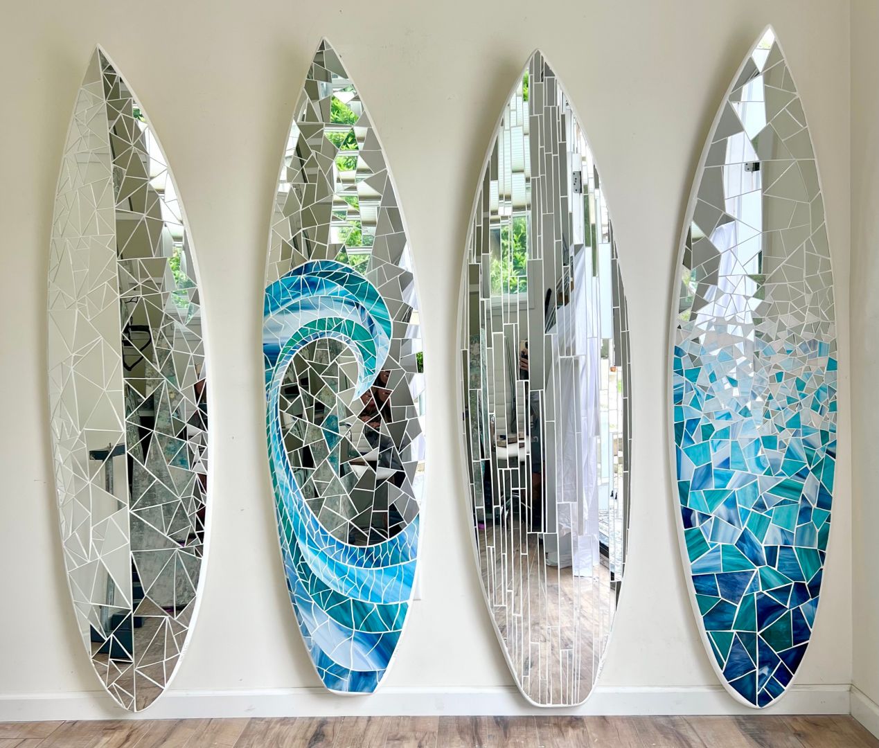 I create hand-cut stained glass and mirror mosaic work on all sorts of interesting surfaces. I’m most known for my mirror mosaic surfboards but I work on all sorts of substrates. I recently installed a set of custom mosaic stair risers and my next project will be a 10′ canoe. My clientele consists of major brands, local businesses and anyone who appreciates original artwork. I earned my BA in Small Business Management and worked in the corporate world for a time before quitting my job to pursue art full-time in 2011. I’ve been grateful to work hard doing what I love ever since. I’m currently doing some bouncing back and forth between SoCal and my home state of Minnesota. I’m looking forward to participating in San Diego’s Little Italy ArtWalk this coming April and will be hosting an opening for my new Studio and Gallery in Marine on St Croix, MN at the end of May.