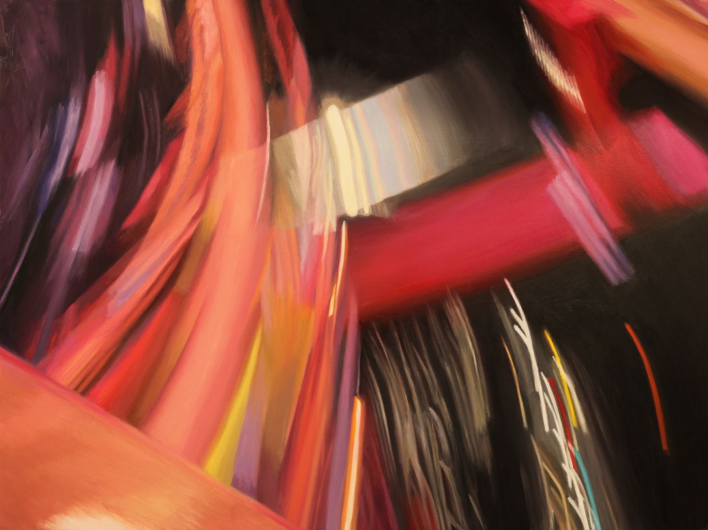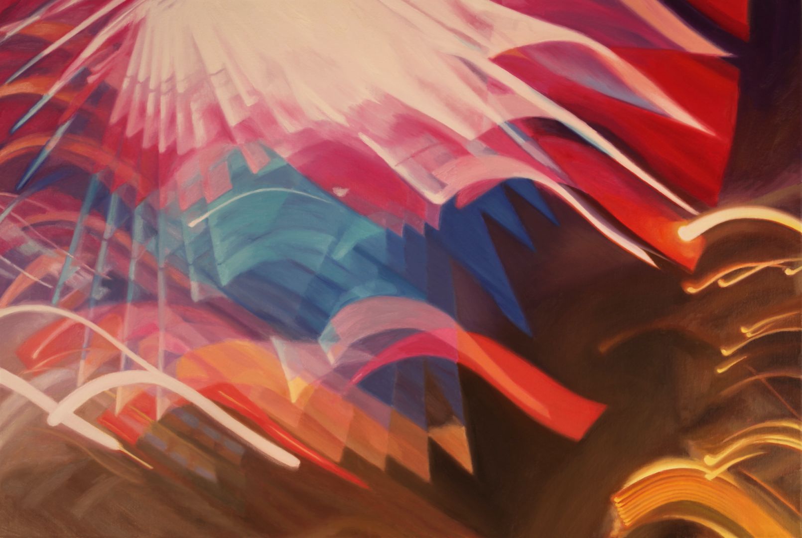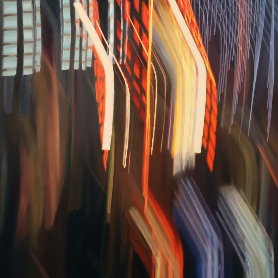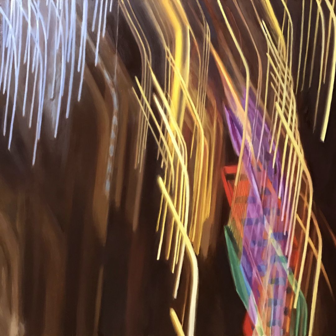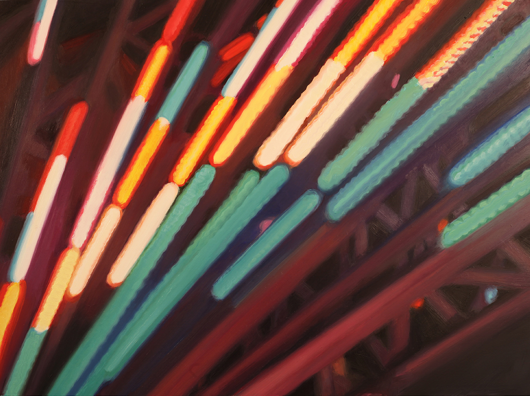I have been making paintings based on roller coaster structures since 2002. All of my work is based on photos that I take while riding in the front car. This idea was inspired by the legend of J. M. W. Turner, who insisted on experiencing a storm at sea by being tied to the mast of a ship, so he could later capture that feeling in his paintings. To the casual viewer, my roller coaster series depicts mere amusements, yet my underlying intention is to reveal the sacred in the profane. The rides serve as icons of our contemporary culture; reflecting the energy and complexity of our lives, as well as symbolizing our desire to escape everyday reality and overcome our fears; experiencing sheer exhilaration while living in the moment. The most recent iteration of my Roller Coaster Series are paintings that are based on photos I took while riding the West Coaster and the Pacific Wheel on the Santa Monica Pier at night. These paintings focus on light streams shining through the darkness, and mark my return to painting after my mom’s death on Christmas in 2016. The light in my work provides glimpses of eternity – our connection with spirit.