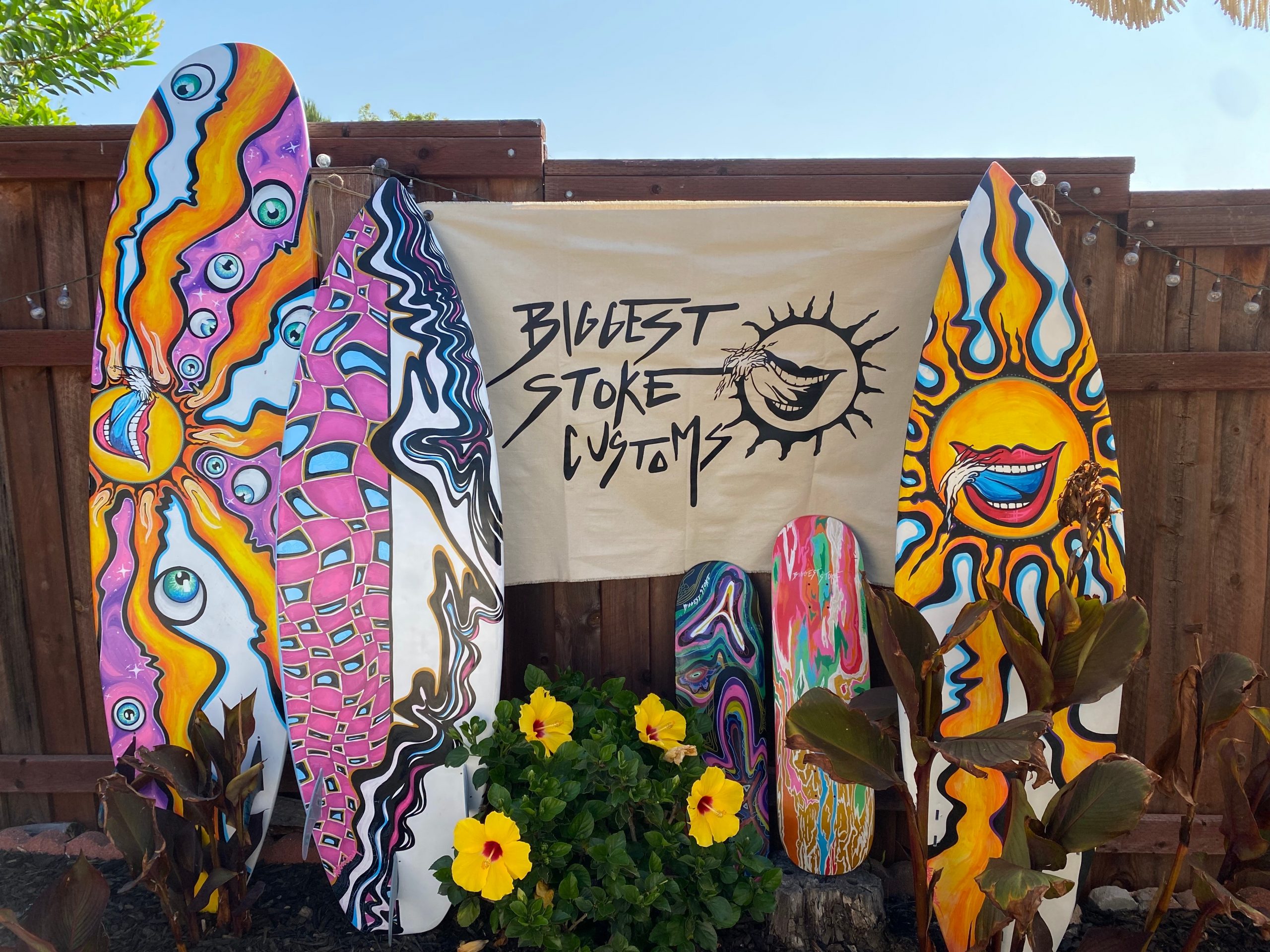 At its core, Biggest Stoke Customs is about more than just art but about invoking stoke through creativity, connection, and reinvention. I use art as a way to bring people together and breathe new life into things, turning them into something unique and meaningful. Much like a tattoo artist, I strive to ensure that each piece I create reflects the individuality and story of the person it’s made for. My goal is for every customer to feel seen and represented in their custom design, transforming their board into a true expression of who they are and what they love.