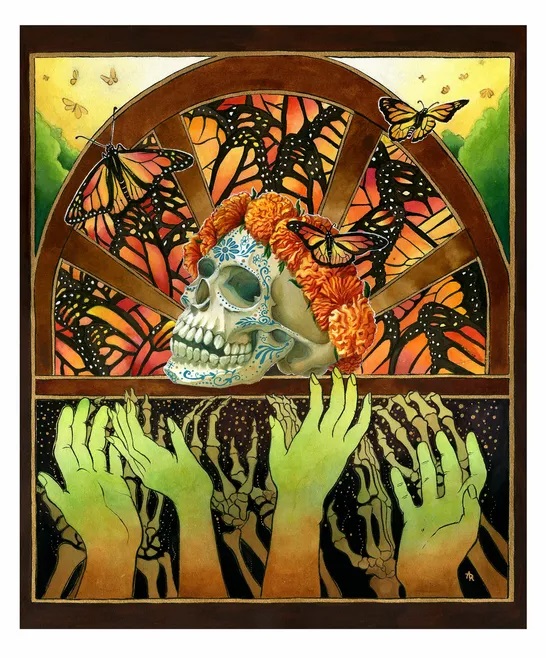 My art involves a lot of skulls. I joke that I’m a failing goth in recovery. My daily wardrobe is mostly black, my playlists are filled music about death and love, my library is a bit esoteric and my art reflects that. I’ve always been drawn the unknown and the greatest unknown is death. A lot of my personal work is centered around it. There’s almost always a skull somewhere in my art, a Memento Mori of sorts. In death there’s fear, beauty, balance, mystery and I’ve always been curious about what happens next. I like to credit my love of all things death to my cultural upbringing (celebrating Day of the Dead) and growing up in my formative years next to the owners of The Museum of Death in San Diego who in exchange for pet sitting, grant me free admission whenever I wanted. The owners were not doom and gloom as you would expect. Instead they were more YOLO saying “Live life to the fullest since you might get hit by a bus!”. This is my own approach to death now too I think. My art is not morbid as most people tend to think. Also impactful was my sister teaching me how to build altars to our ancestors on Día de los Muertos. It really gave me an appreciation for life, death and made me wonder about the afterlife. I’m not religious but most every culture and religion has something to say about it and there’s a long tradition in the arts to interpret that. It’s the greatest mystery. Professionally there are 2 things I’m most proud of. I curated a show about death in SF a few years back called “The Good Death” as part of a city wide death and life symposium. I invited artists of all types to create artwork about how they felt about it, their own personal experience with it, or just an image inspired by death. It was a fantastic body of work, filled with raw, beautiful, touching and even funny artwork. The second thing is my series on Victorian Death customs. I got really interested in this period of time where the Victorians were just obsessed about everything death and after much research I was inspired to illustrate 6 large illustrations reflecting the various customs I was drawn to the most. This project really crystalized artistically for me a subject that I now know I’m not going to be done exploring anytime soon. In fact I have 2 more series that have been percolating in my mind. One is about deadly Flora and Fungus and another about Day of the Dead.