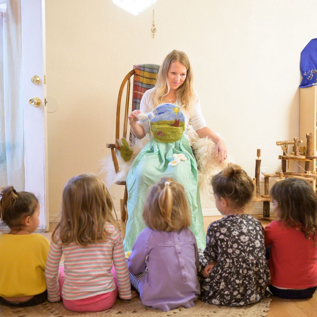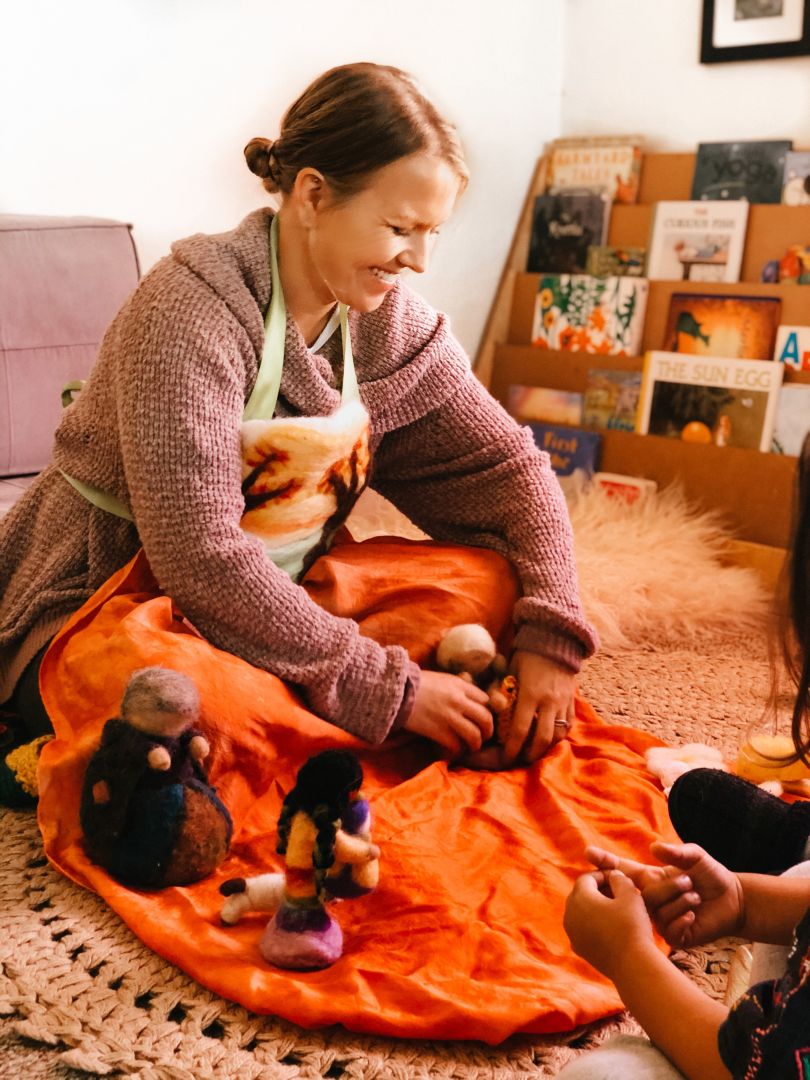 I run a small in-home Waldorf-inspired preschool. I am a trained Waldorf teacher and have taught at the Waldorf School In Ann Arbor, MI and here in San Diego. Waldorf is a holistic approach to education focusing on nature, the arts, the imagination, and the whole child (the head, the heart and the hands). It is play-based and we encourage children to take initiative and do things themselves. We bake, we sing, we do yoga, we get outside and be with nature and move our bodies. We teach through imagination, and the children experience everything from doing. I also make YouTube videos for families at home looking for Waldorf things to do and those with children at home due to the pandemic. I also do a lot of puppet shows. I hand make all the puppets from wool. I also wrote a children’s book using my puppets as the images.