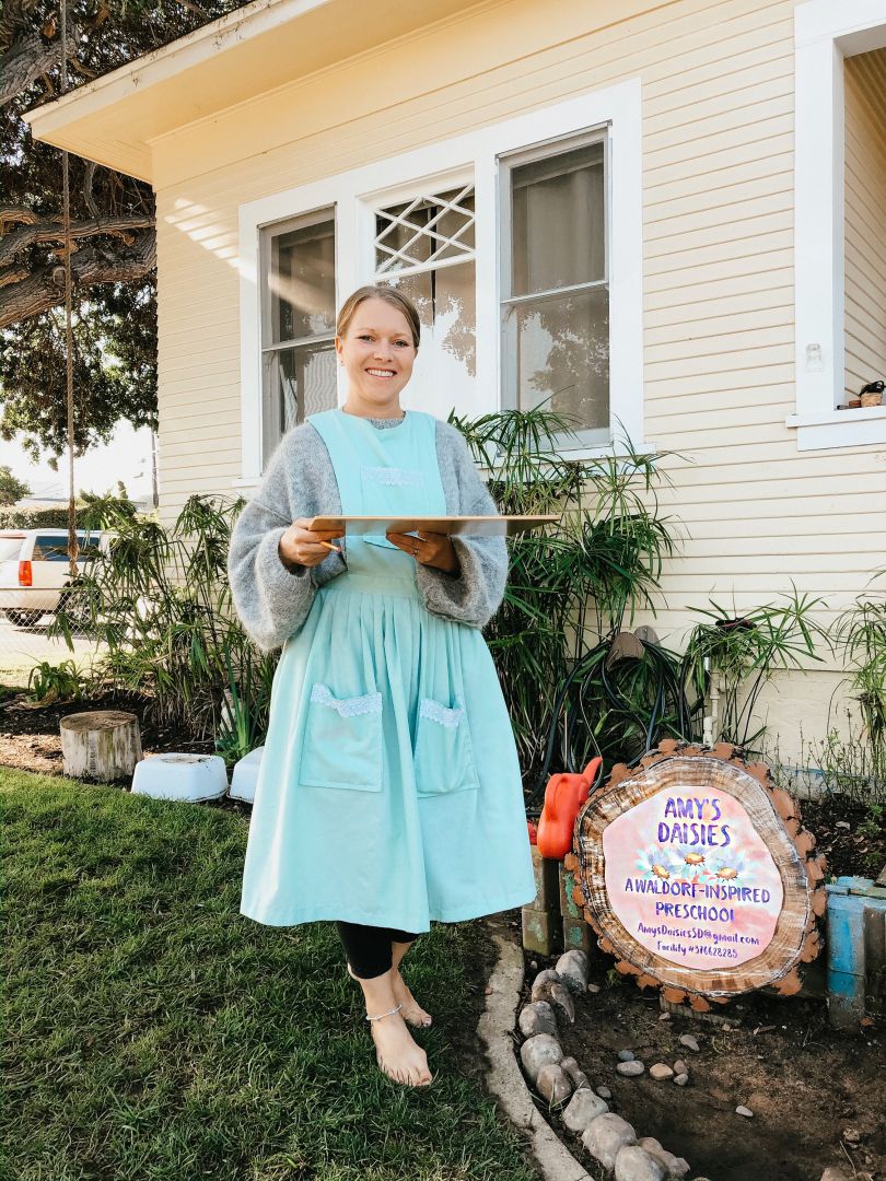 I run a small in-home Waldorf-inspired preschool. I am a trained Waldorf teacher and have taught at the Waldorf School In Ann Arbor, MI and here in San Diego. Waldorf is a holistic approach to education focusing on nature, the arts, the imagination, and the whole child (the head, the heart and the hands). It is play-based and we encourage children to take initiative and do things themselves. We bake, we sing, we do yoga, we get outside and be with nature and move our bodies. We teach through imagination, and the children experience everything from doing. I also make YouTube videos for families at home looking for Waldorf things to do and those with children at home due to the pandemic. I also do a lot of puppet shows. I hand make all the puppets from wool. I also wrote a children’s book using my puppets as the images.