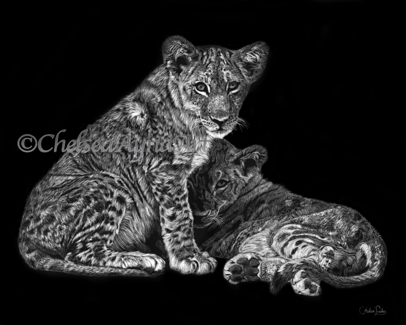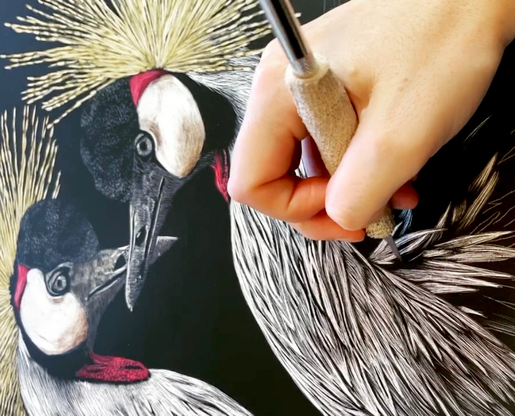 I owe a majority of my art career to several other artists. So many of them from all different mediums, styles, and walks of life. Starting from when I was 10 years old, I owe my initial interest in art to those artists whose books I learned to sketch from as well as movie and show illustrators for who I was able to re-create their scenes in my sketchbooks. When I picked up art again in my adult life, an artist, Laovaan, inspired me to get into watercolor and his style will always ignite a big inspiration in me when it comes to painting. For my primary medium now, Lori Mitchell (my art instructor at UCSD), is who introduced me to my first scratchboard, and it was all downhill from there. I will always be forever grateful for that last assignment. For my first art shows, the support of Cayce Hanalei with Hanalei Artworks, was immense in helping launch my business and I can’t thank her enough for all the hard work she put in to helping emerging artists. As for other artists who continue to have a huge impact on my art career, and who I take inspiration from, are Lily Adele, Kaetlyn Able, Polina Bright, Amy Stauffer, Tori Ratcliff, and Rachel Altschuler to name a few. I also can’t leave out my friend, Marissa Raskind, who begged me for a pet portrait when I first started painting, and that launched my pet portrait commissions. Lastly, along with the continued support from my family and friends, my husband has been my biggest fan and advocate.