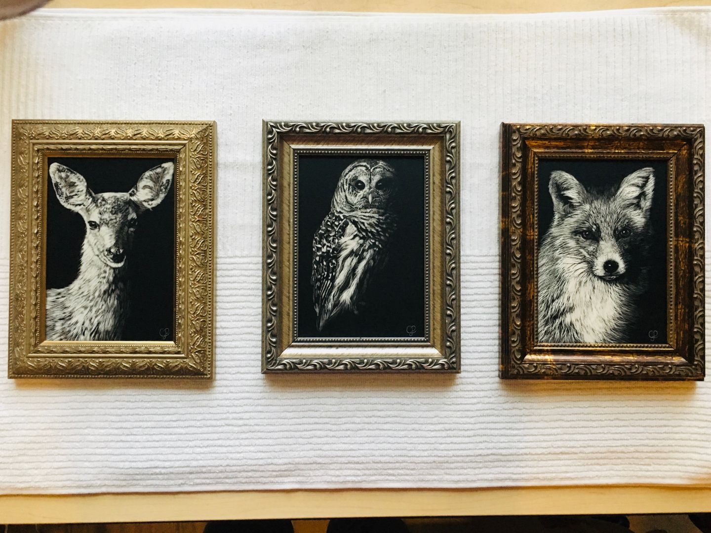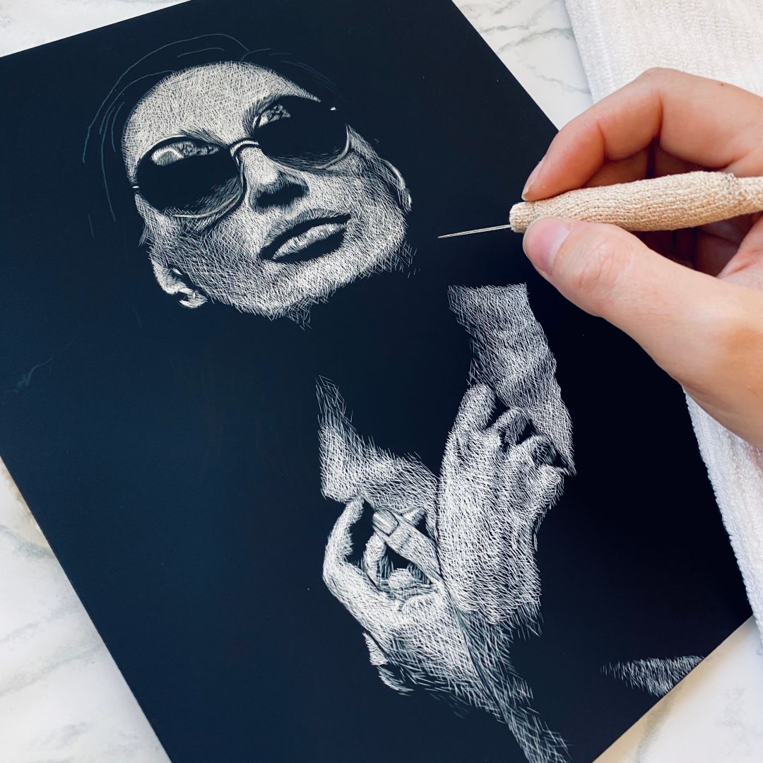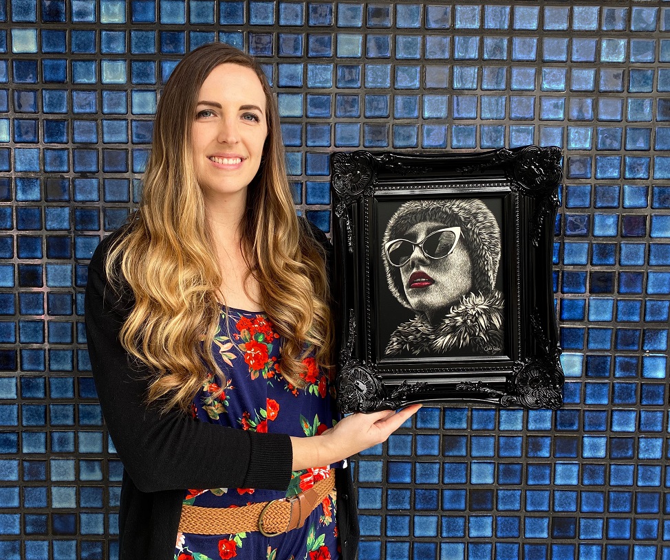 My art journey to where I am at now first unfolded as I developed a passion at a young age, filling up my first sketchbooks at the age of ten. Although I loved drawing, it was always just there, almost as a hidden talent I had, all through my adolescents. I would sketch when I was feeling the urge or when I was bored at work, but never really did much more than simply sketch. It wasn’t until my mid-twenties that my interest sparked in exploring new mediums and I was opened up to a world of artists and talent I could never have imagined. I was naturally drawn to watercolor the most and that is where I started. I owe so much of my art career to social media enabling me to be self-taught. I explored online tutorials, other artists’ methods, and I hit the ground running in creating portraits of women, wildlife, and pets. In hindsight, I think one of the biggest challenges is that I didn’t allow myself enough time to really learn before I started taking on commissions and wanting to create as much as I could as fast as I could. It was the pressure of commission and print requests that, even though I loved being able to make money from, I went into fast forward business mode without allowing myself to really grow. Although I could see myself progressing with every piece in the beginning, I think that kind of leveled off and I got burnt out from business and the passion began to fade for watercolor. Once I stopped commissions, I was really able to get back to developing as an artist and I enrolled in classes at a local university. This was one of the best decisions I could have made. It was back to basics drawing and the animal illustration class I took introduced me to my first scratchboard. The first few marks on the scratchboard assignment, I was hooked and I knew it was a medium I wanted to pursue. My biggest passion for scratchboard rests within the ability to make subjects appear that they are rising from or fading into dark. It is a dramatic effect. The medium is unique in itself. A majority of people have never heard of it. The idea that you use sharp tools like XACTO blades, tattoo needles, and fiberglass brushes to create these dramatic pieces is sometimes hard to believe. As for my subject matter, my goal as an artist has not just been to mirror the images I am creating from, but to re-create them in such a way that ignites emotion in everyone who views my art.