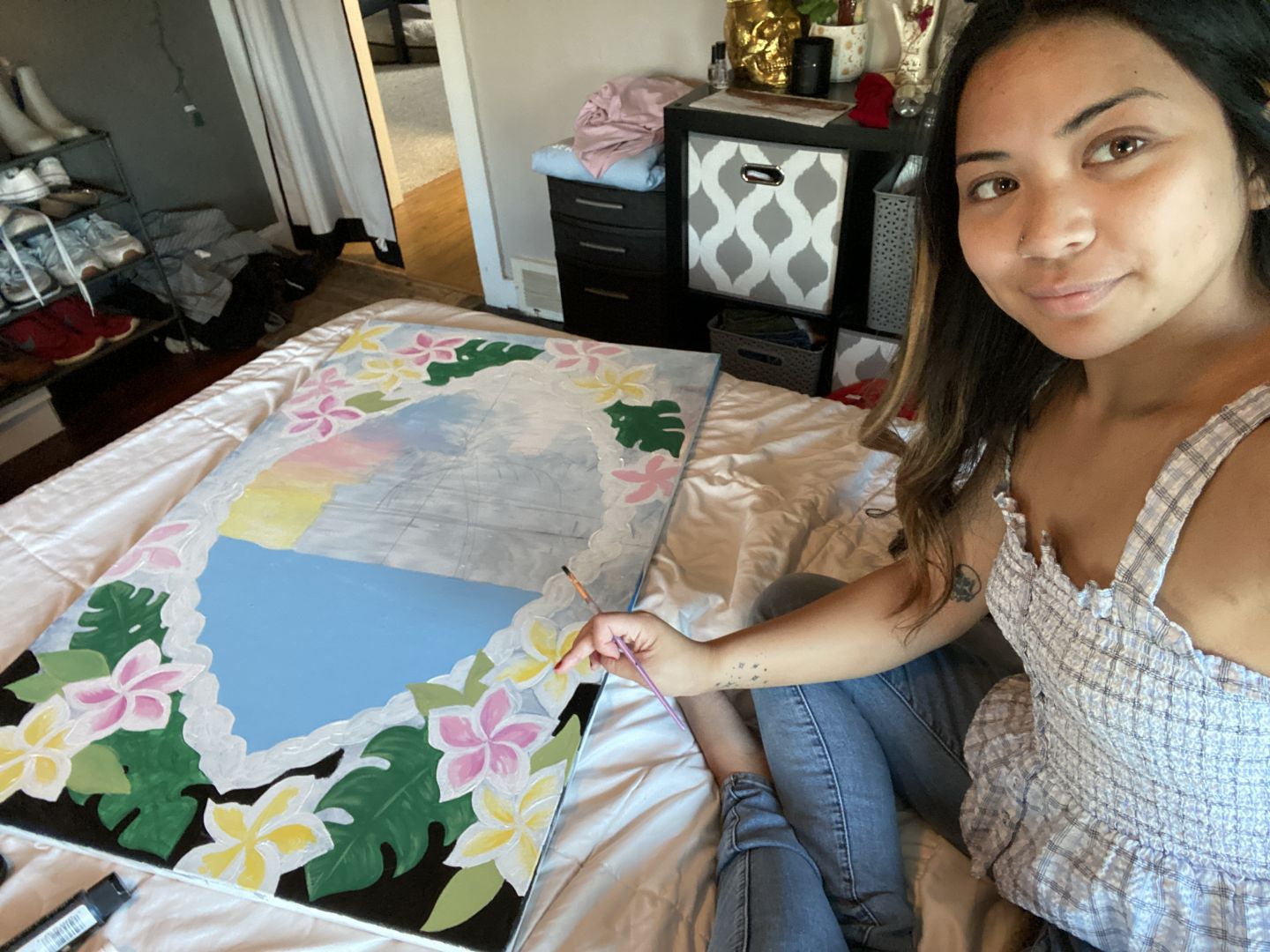 Everything is always changing and growing. In the past couple years I have slowly been creating a business for my art. I used to draw doodles and post them on social media and my friends suggested that I should turn them into stickers. I started selling stickers and also tattoo designs. I’ve painted Hydroflasks and even a photo backdrop for my brother‘s wedding. I’ve learned that you have to put in the work to get you where you want to be. I never knew exactly what career I wanted; I just knew it was going to be something in the art field. When people see my art they always ask if I’ve ever thought about being a tattoo artist. I was always hesitant about it and never saw myself as creating something permanent on someone else’s body. Eventually — after a couple of years and a few tattoo designs, I came around to the idea. I plan on finding a tattoo apprenticeship in the near future and working towards that goal.
