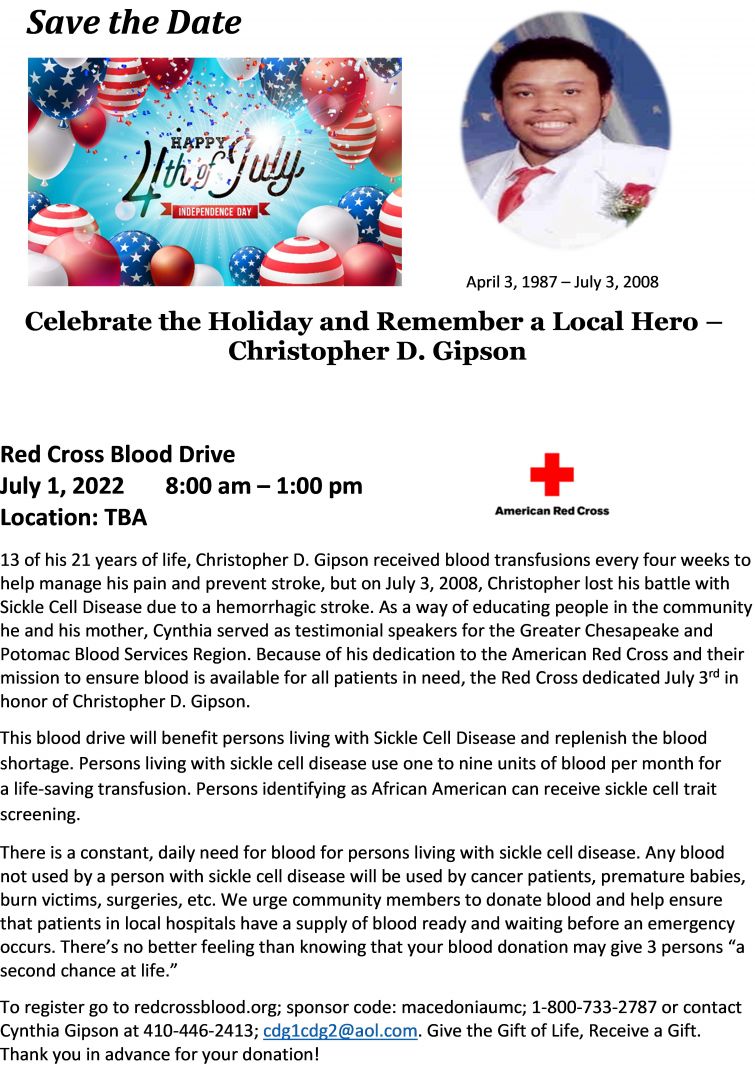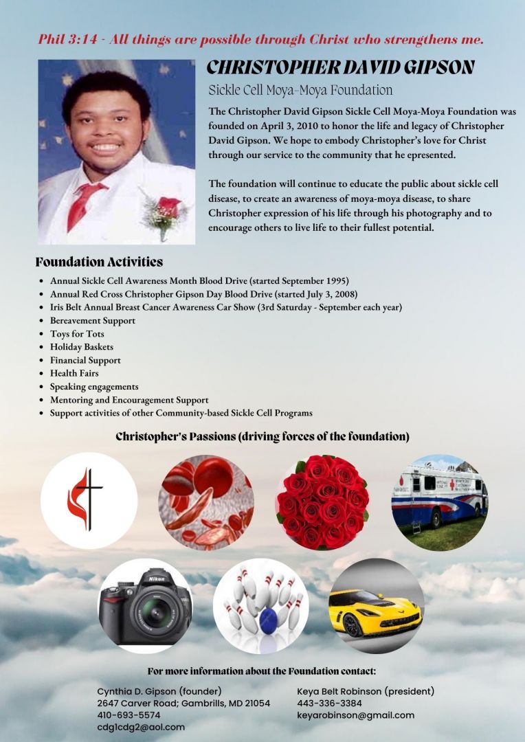 I am the mother of a son, Christopher David Gipson who was a sickle cell warrior. Christopher succumbed to his disease on April 3, 2008. He had stroke at the age of 8 and a hemorrhagic stroke at age 21. As a parent of a child with a disability it is important for him to have faith, belief in God’s teaching, and realize that he is a child of God and as God’s creation he is good. Christopher’s disabilities included – sickle cell disease, moya-moya disease, aphasia, seizure disorder, learning disabilities, and physical disabilities. As a young child he was exposed to God’s teachings, he was told about his illness to his understanding, he was exposed to an educational, cultural, and moral lifestyle. He was the product of parents that instilled the importance of education, humility, creativity, risk-taking, loving self and others. These qualities were beneficial to him after he suffered a stroke at the age of eight that altered his life course.
