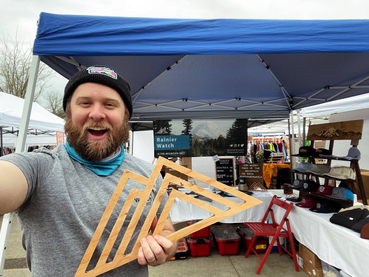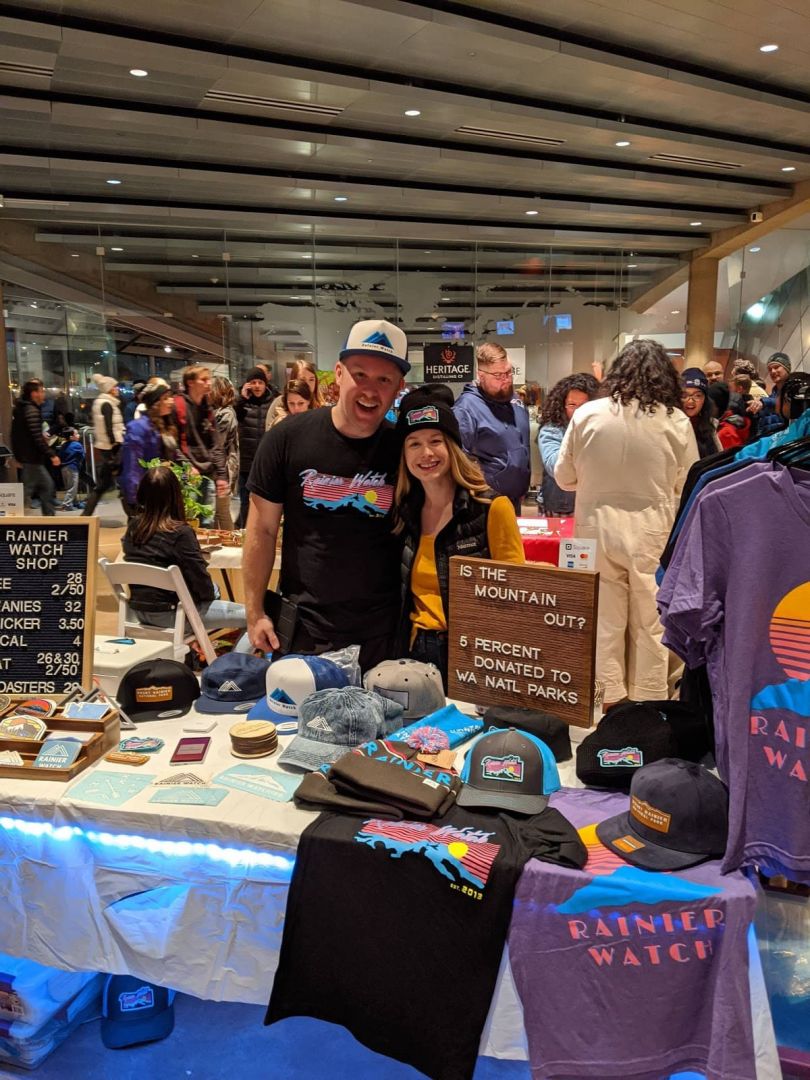 It was one of those things that just sort of happened – basically I saw a need for my business and I jumped up and filled it! To back up a step, I started Rainier Watch as a way to answer “Is The Mountain out?”, a very important question here in the Pacific Northwest. For anyone not familiar, we have a local mountain, Mount Rainier, that dominates the skyline and can be seen hundreds of miles away when it’s clear. Being the PNW though, its very seldom clear and is often overcast and rainy (the rumors are true!). So before I started my business I looked around the internet to see if there was a way for people to know if The Mountain was out — there wasn’t so I launched the RW Twitter account and would tweet daily on my bus commute into Seattle. (You can read the full story on RainierWatch.com/about). Years after that and after growing the online community, people asked about merch and about supporting Mount Rainier National Park so I combined those thoughts and launched The RW Shop featuring lots of awesome apparel that helps support the National Parks. Things have just snowballed from there and now the RW community has over 50,000 followers across social media and I’ve donated over $6,000 since 2020 to causes like protecting the parks, wildfire relief efforts, and supporting diversity and inclusion in the outdoors.