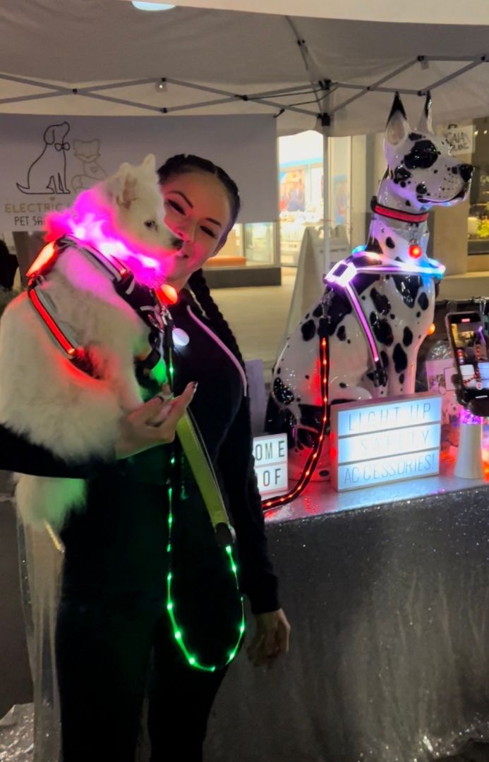 I am most excited about how many customers have supported my small business. Each pet I see in Electric Lala Land’s safety glow makes my heart happy. It’s been a long journey of figuring out how to legally become a business: getting my LLC, joining local San Diego farmers markets, becoming an instagram seller, and helping customers find what safety light-up product will work best for their specific pet and unique needs. I am so proud and excited that we have had pets from dogs and cats to turtles and bearded dragons use our light-up safety accessories.