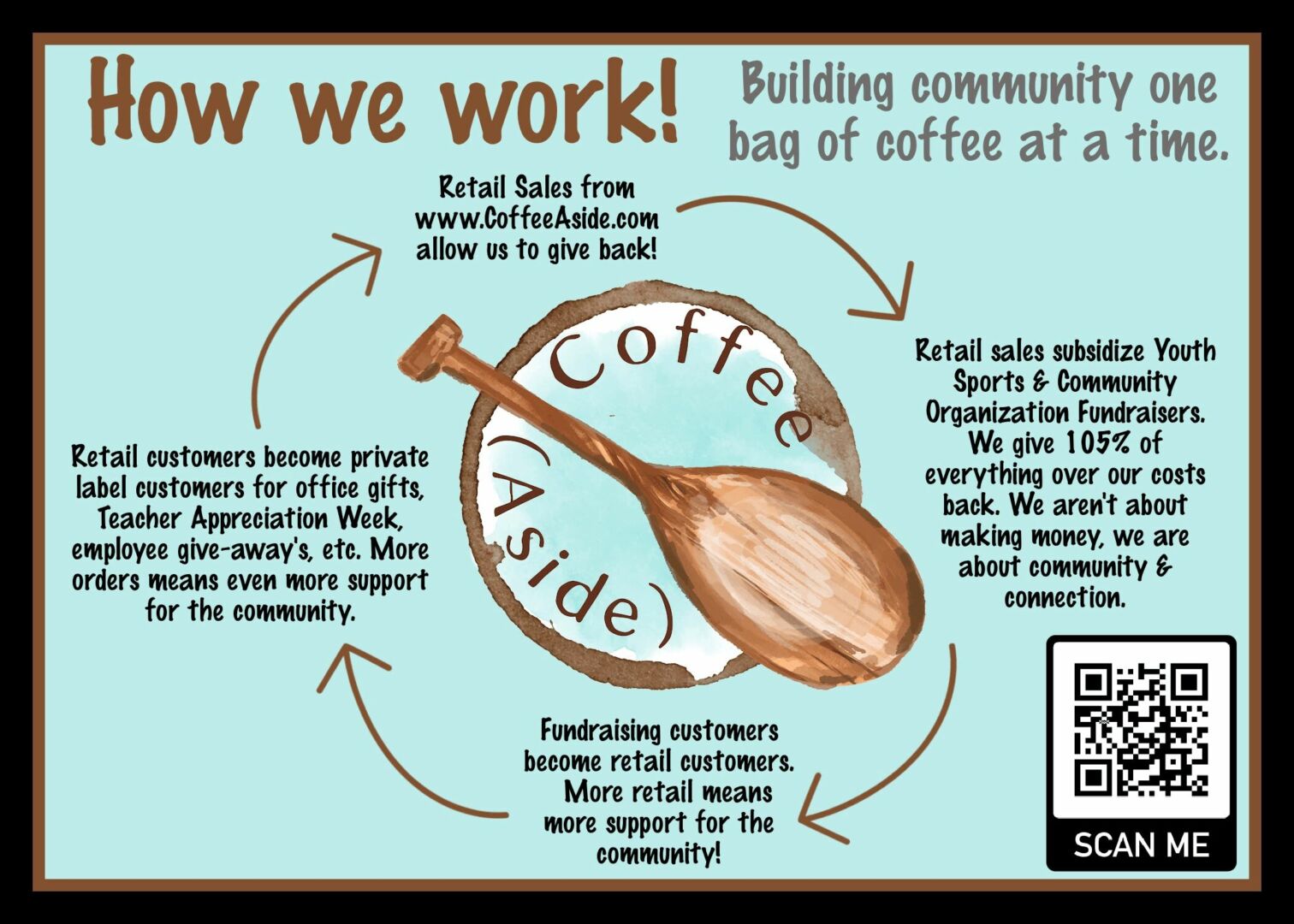 The most important factor behind our success at CoffeeAside.com is that people love what we are about: Building community, one bag of coffee at a time. We specialize in custom labeled, Specialty Grade, fresh roasted coffee. And we have found a niche in using those labels to do fundraisers for all types of youth sports and other youth-based organizations. We create coffee bag labels for these groups with their logos and tag lines to sell in their fundraisers. We know the value of young people being involved in sports teams, groups, clubs, music programs, cheerleading, church youth groups, Scouts and more — but we also know that many of these groups need extra help with funding. So we are excited to be building community through these efforts to support youth in a unique way!