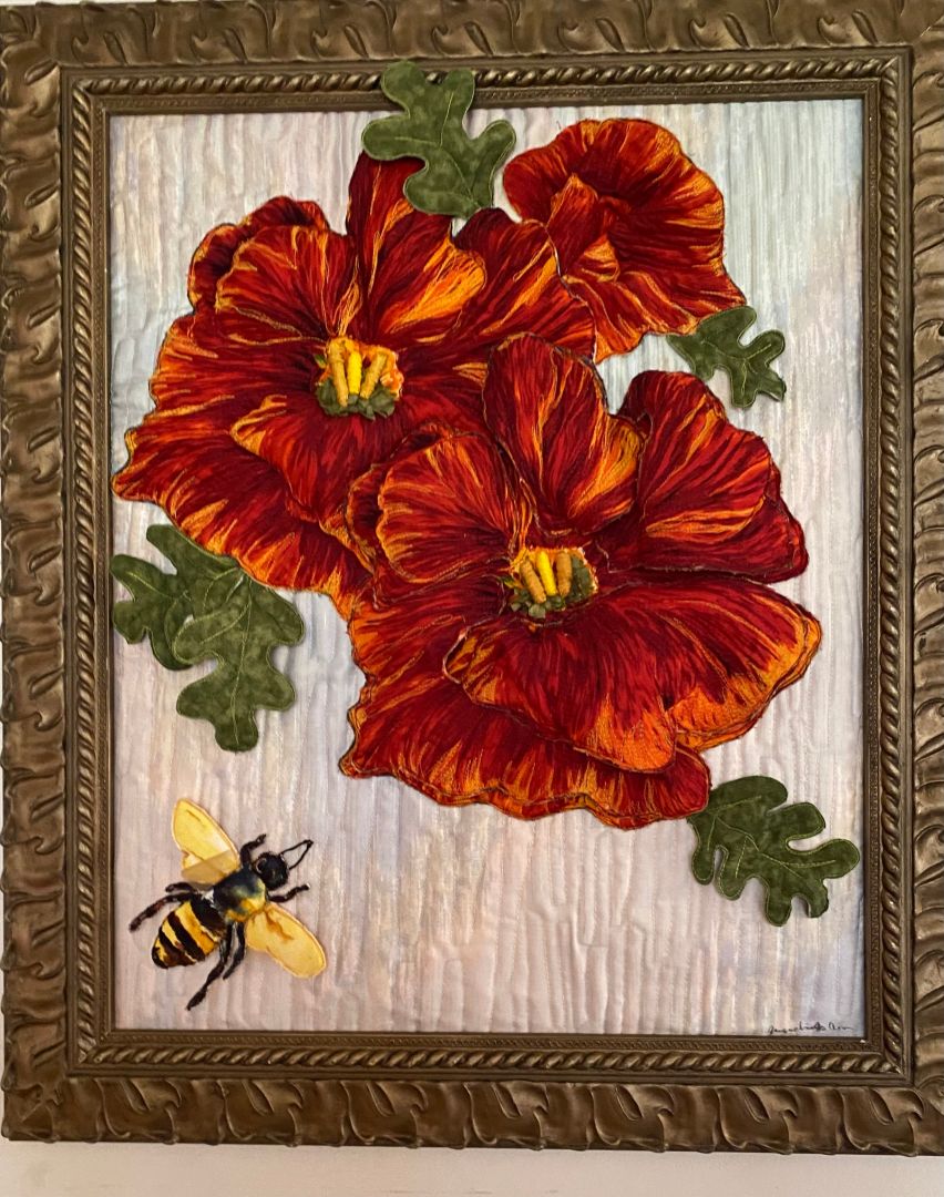 I paint with fabric, threads, and beads. I hand cut my designs. Once the pieces are laid out and quilted, I hand embroidery details.
