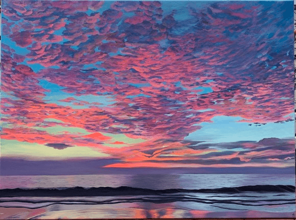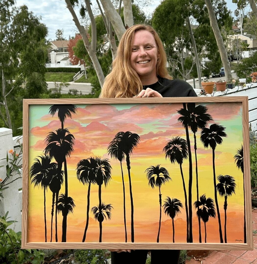 I have been drawing ever since I could use a pencil. It has always come naturally to me. My parents are both artists, I have always loved doing it. I used to hand make greeting cards when I was 15 and the owner of the shop they were in was so supportive. Started selling art at a farmer’s market. Started having shows at local breweries and spots along the coast and San Francisco. I have learned everyone can be an artist but it’s just how much you put into it. It truly takes years and years of practice to become good at painting. It takes layers and layers to make a painting look good. It takes so much time! I just want people to be happy when they see my art. I love colors and sunsets and flowers and I hope these pieces just make people smile!