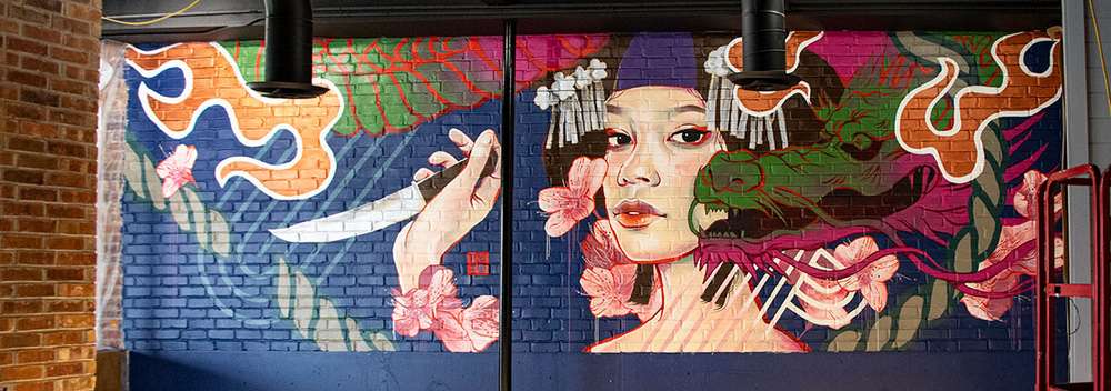 I’m a Japanese+American artist. I was born in Tokyo, but grew up in the US since age six. My art is driven by themes of Japanese history, folklore, and kabuki plays. When I paint these subjects, I feel both a comforting nostalgia, and the joy of discovering something new about Japan. I spent most of my time painting big murals outside, but since covid had reduced the number of initiatives, I also paint in my studio.