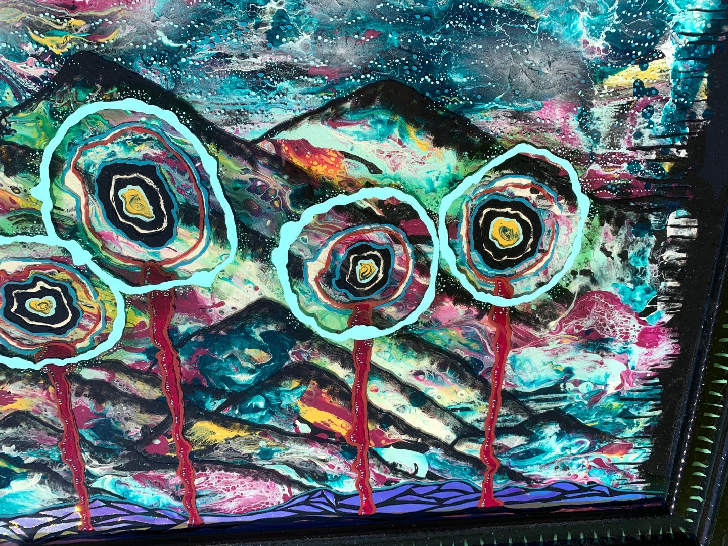 I personally don’t consider myself a professional artist rather I just keep doing what I love and never give up. That is the lesson I have learned with my own experience with art. If you love to do something, just keep doing it no matter what. Eventually you just become more confident and the art comes out more natural and from the heart. Early on my art was very typical in subject matter but has evolved into a more subjective and discrete theme. Multiple people could view the same art piece that I have done but feel and interpret it in completely different ways. I don’t necessarily start a project knowing exactly what impression I want it to leave on someone viewing it. I may start off with somewhat of a doodle and then as it starts to progress I may lean toward a certain mood that I feel it is progressing towards. I like to keep the impression of my art more open to whomever is viewing it which allows people to create their own feelings about it. These are concepts I’ve learned from favorite artists of mine. The reason I really enjoyed their work was not so much because I understood the piece, but more because I didn’t. I still enjoy creating the typical subject matter as well but with an added twist. Such as using a variety of mediums as well as painting on different objects. One thing you’ll find in my art is I will always incorporate nature as I do have a strong connection with the beauty of earth.