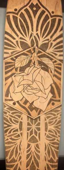 Stepping away from tattooing and into other creative outlets, I love to paint and work with wood burning. The last couple years I have played around with wood burning on multiple surfaces but I am most proud of the longboards I have created. Getting to where I am today was not easy and I still have a lot to learn and space to grow. Creating in these different mediums outside of tattooing has helped me stay sharp and come up with new concepts for my work. There is nothing easy about making a living off of your creativity. There is a constant push and want that you must have to better yourself and your craft. Sometimes you have to get uncomfortable, step outside your limits, to learn and grow and get better. I have learned that it takes a great mental push to keep climbing to where I want to be in my career.