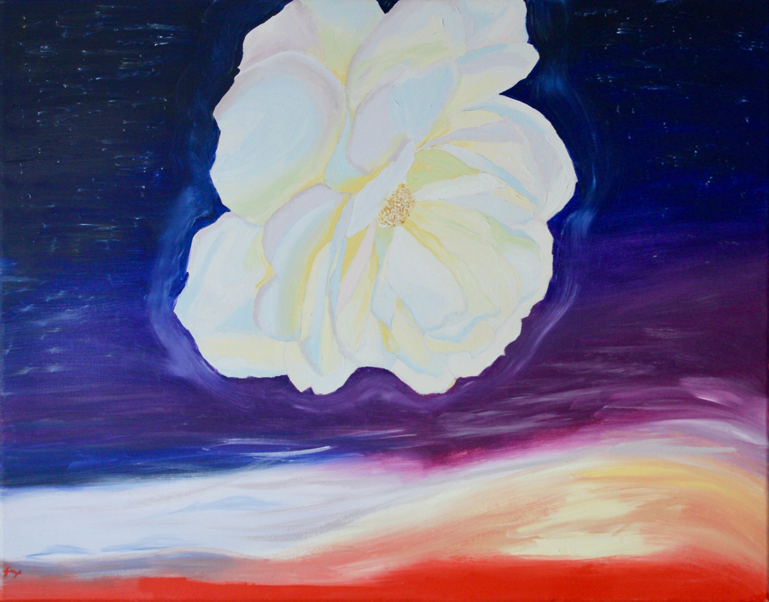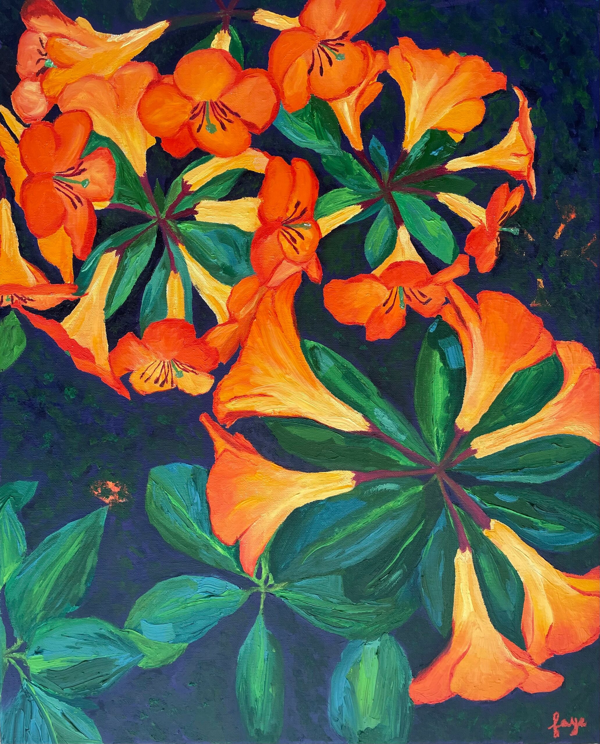I started my art career selling prints of my paintings on Etsy and at markets. I met so many amazing people and creatives, but markets were hard on me physically, emotionally, and financially. I found that I would pay a fee to vend and find myself sitting for hours watching people’s disinterest in my art, often not breaking even at the end of the day. To avoid this, I tried to make more commercial art, but my intuitive approach was lost in the process. I had to reorient my practice toward the feelings I wanted to inspire within myself through creating the art and within those witnessing it. I want my paintings to feel like the difference between saying “That sunset is beautiful” and saying “That sunset makes me feel lucky to be alive.” The colors in my paintings speak to euphoric joy and a sort of youthful approach to portraying the wonders of nature. I feel like it’s important that my art is problem-solving in this way rather than trying to be an object for consumption. I am not someone who paints all the time. I wait for natural inspiration and acting on that spark with urgency and as a timestamp of a moment rather than methodically or even in a disciplined way. When I step away from being overly-disciplined, I feel free.