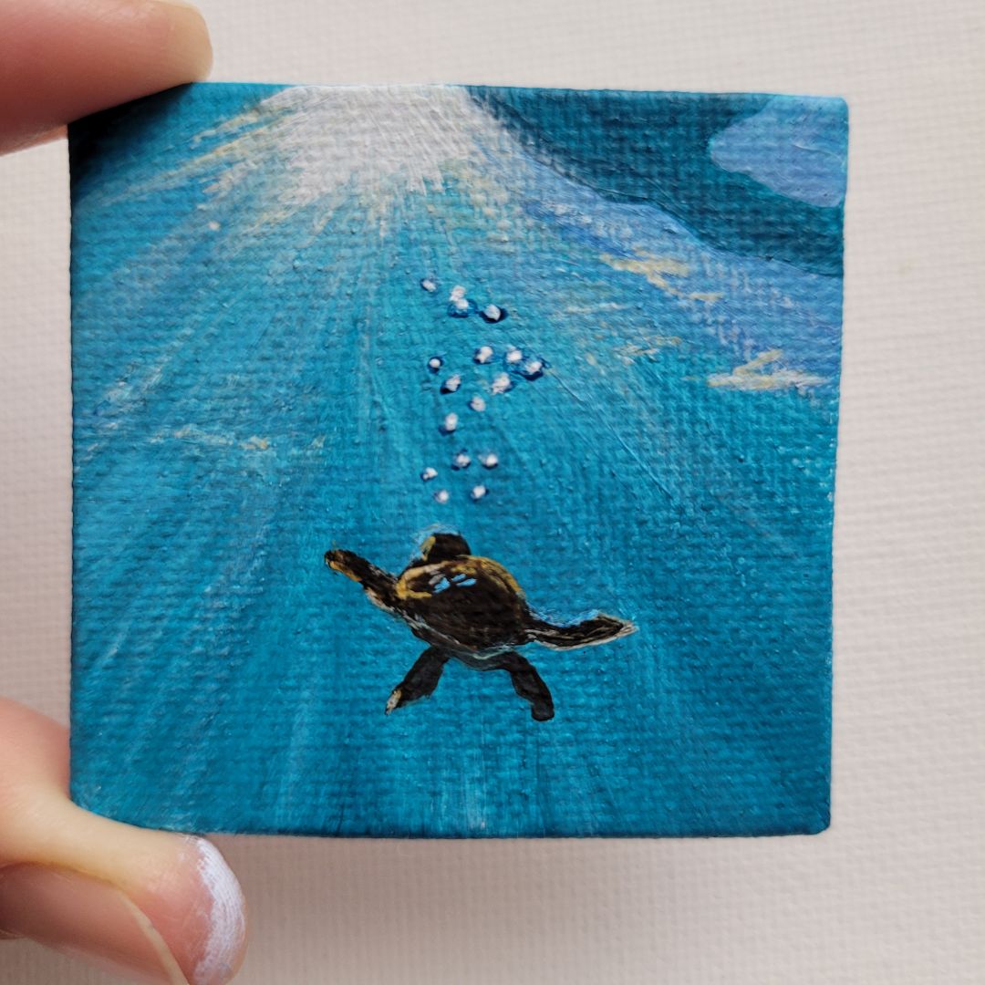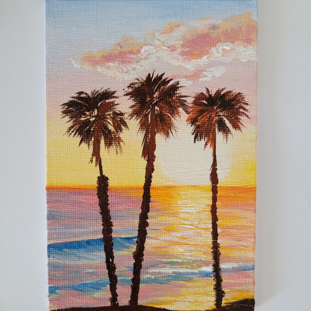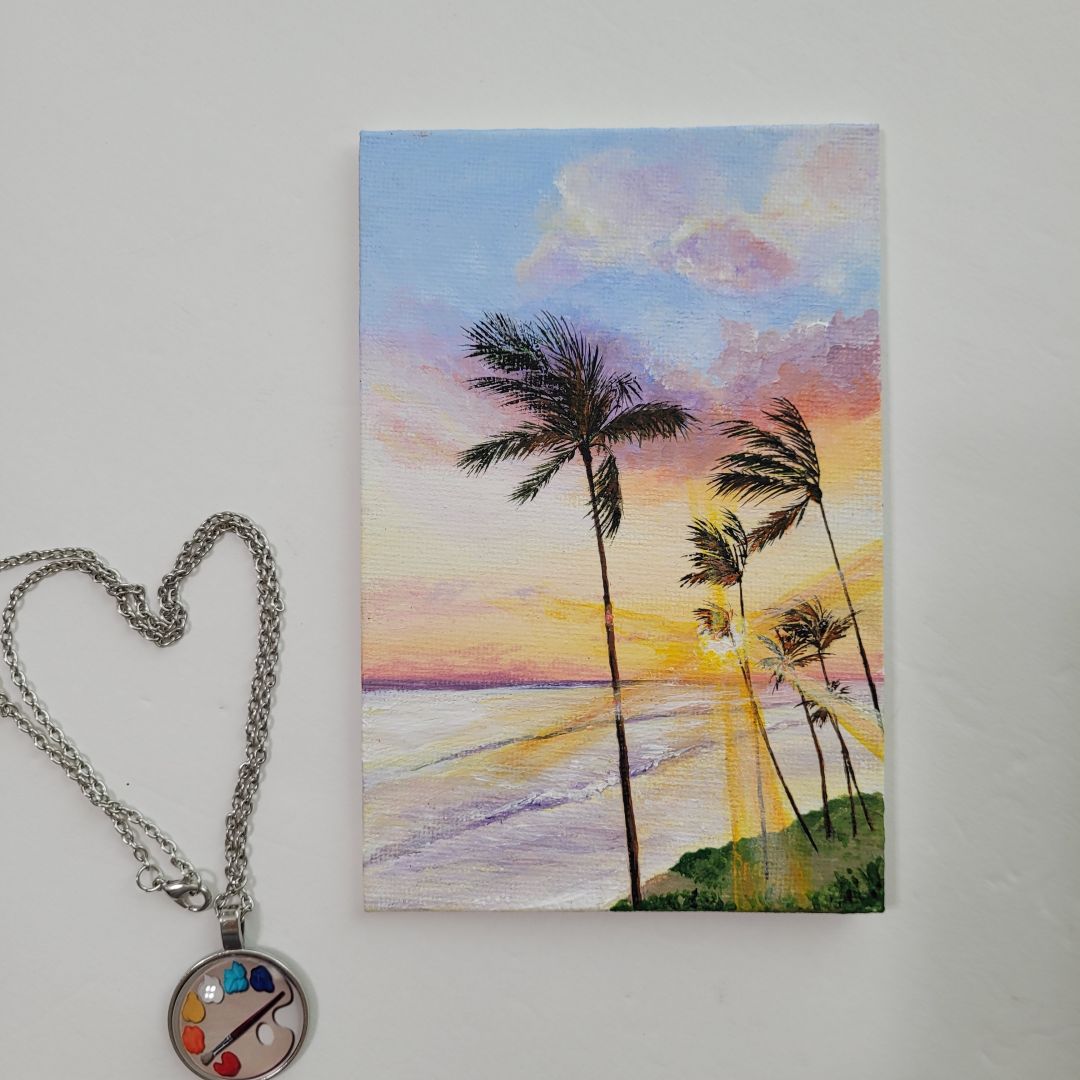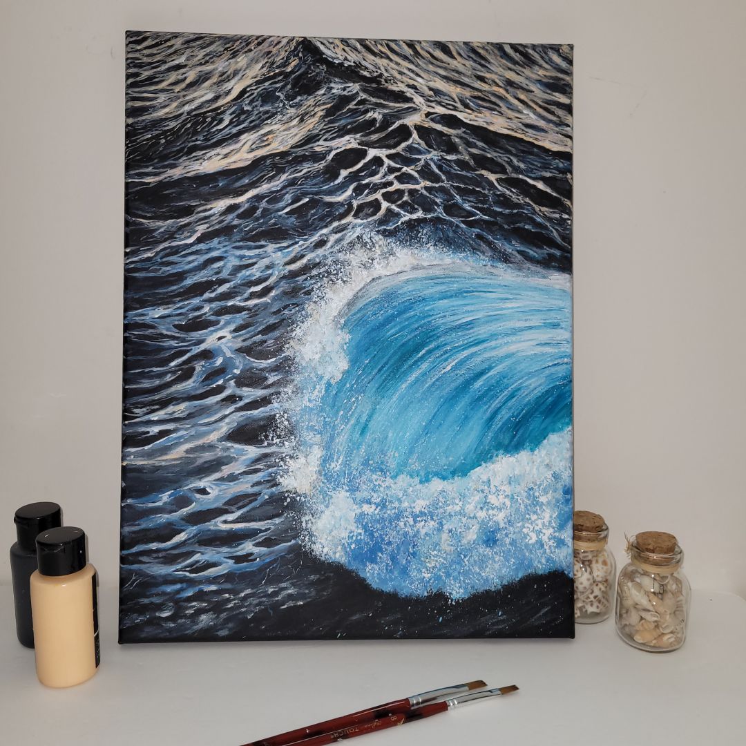 I’m completely self-taught. I paint with acrylics on canvas, paper, wood. My biggest inspiration are coastal views and the ocean. I’m particularly proud of my signature collections of miniature paintings.
