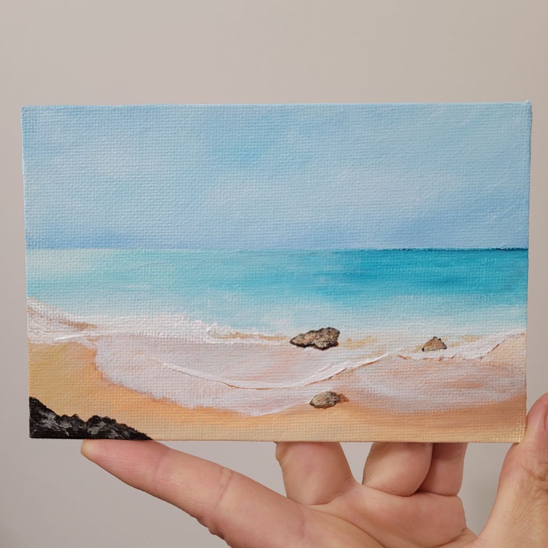 I’m completely self-taught. I paint with acrylics on canvas, paper, wood. My biggest inspiration are coastal views and the ocean. I’m particularly proud of my signature collections of miniature paintings.