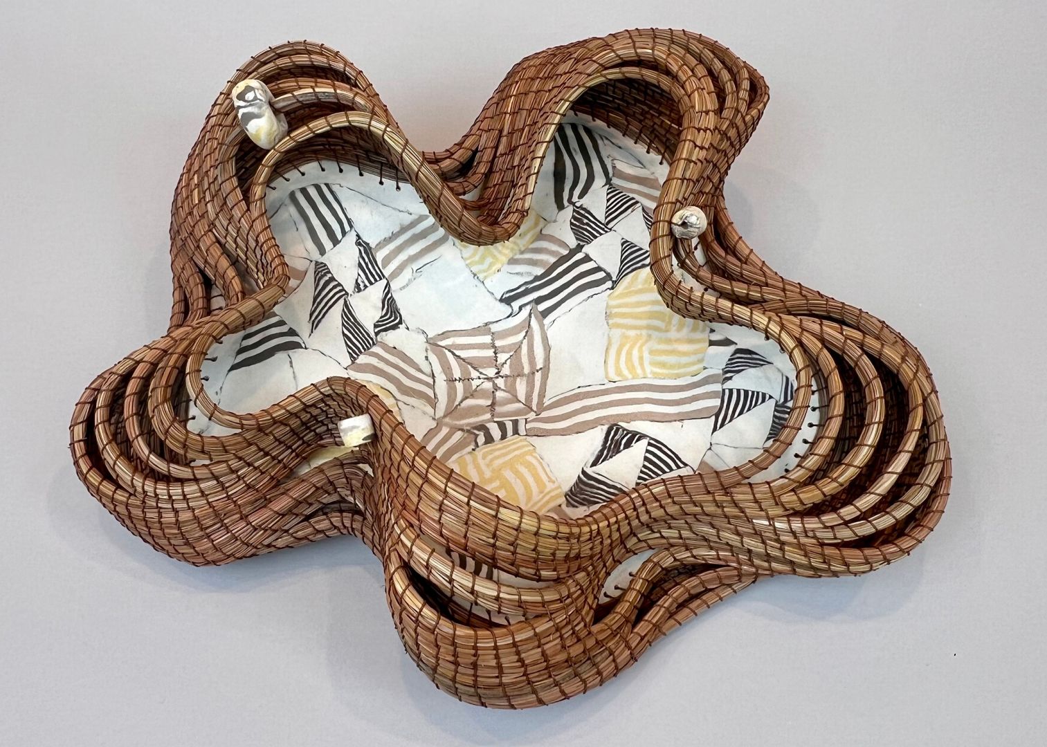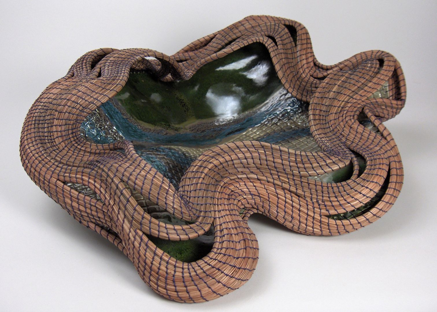 However, I always missed creating fine art. It was never far from my mind. When my youngest child entered preschool, I got a little more creative space and was able to start drawing and painting again. When we lived under some messy long needle pine trees, I started using the downed and dry needles to make pine needle baskets. When my youngest started a neighborhood clay class at the local community center, I started one also, adding clay to my pine needle work in unusual combinations.
