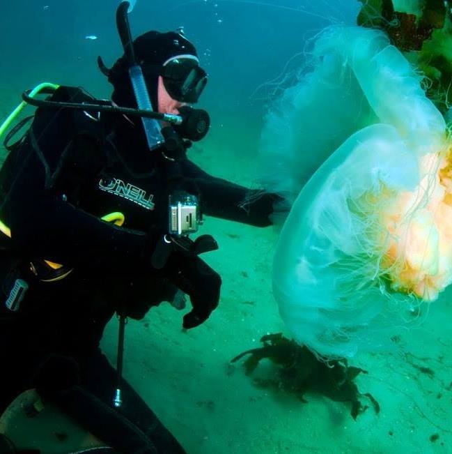 For the photo of me ascending up through the kelp, please credit: Scott McGee For the photo of me photographing a sea anemone on the bottom (with the bright light), please credit: Barbara Lloyd For the photo of my with the rather large jelly fish, please credit: Greg Amptman For the photo of me in dive gear, sitting on a boat with the ocean in visible in the background, please credit: David Hershman For the B&W photo, please credit David Hershman For the photo of me smiling with a cap on, please credit: Barbara Lloyd