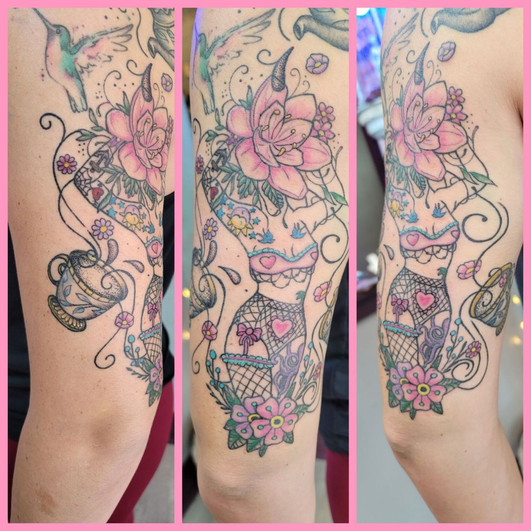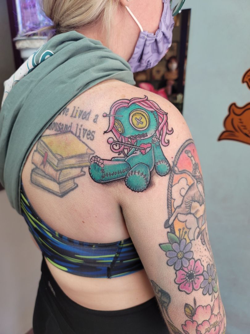 As far as style goes, I’m into everything. Although realism is beyond my current tattooing skill level, it is something I might delve more into someday. For now I’m focusing on making the world a little brighter with fun, colorful, fanciful designs. A lot has happened in the last 5 years and I think we could all do with a little more silliness and fun. I’m basically still a 5 year old just wanting to make and share art.