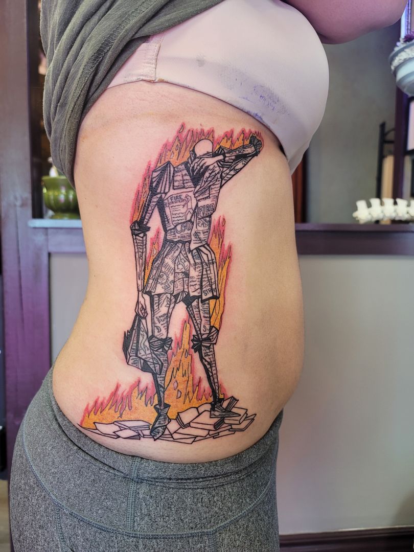 Like most tattooers, I’ve been an artist all my life. My professional art career started when I decided to own up to it and go to art school, having tried to lead a normal life- crashing and burning repeatedly. I started out studying architecture, when I had to take calculus, It felt like it might as well have been in written in German. I realized maybe architecture wasn’t for me because even if I miraculously landed a position in an architecture firm, I most likely wouldn’t get to even have a hand in building anything interesting. So I took what I learned from Architecture and switched my focus to sculpture. I was able to experiment with many different mediums while making 3D art. After graduating, I lost access to the sculpture lab and all the materials. I was living in a studio apartment, I didn’t have room for making sculptures so I satisfied my artistic craving by creating 2D paintings that appeared to be 3D. I then moved into an artist loft building where I worked on a few large projects including painting a public art sculpture for the city. Before diving back in to sculpture I got the opportunity to apprentice as a tattoo artist, and I’ve been focusing on tattooing ever sense. It’s a whole universe of craziness that I’ve just barely scratched the surface of, but I want to learn everything. It gets overwhelming at times, but I just remind myself if how lucky I am to be able to get to do this as a job. I try to not take myself too seriously and use each day as a way to learn something new.