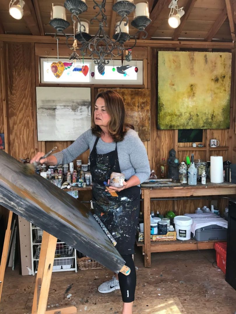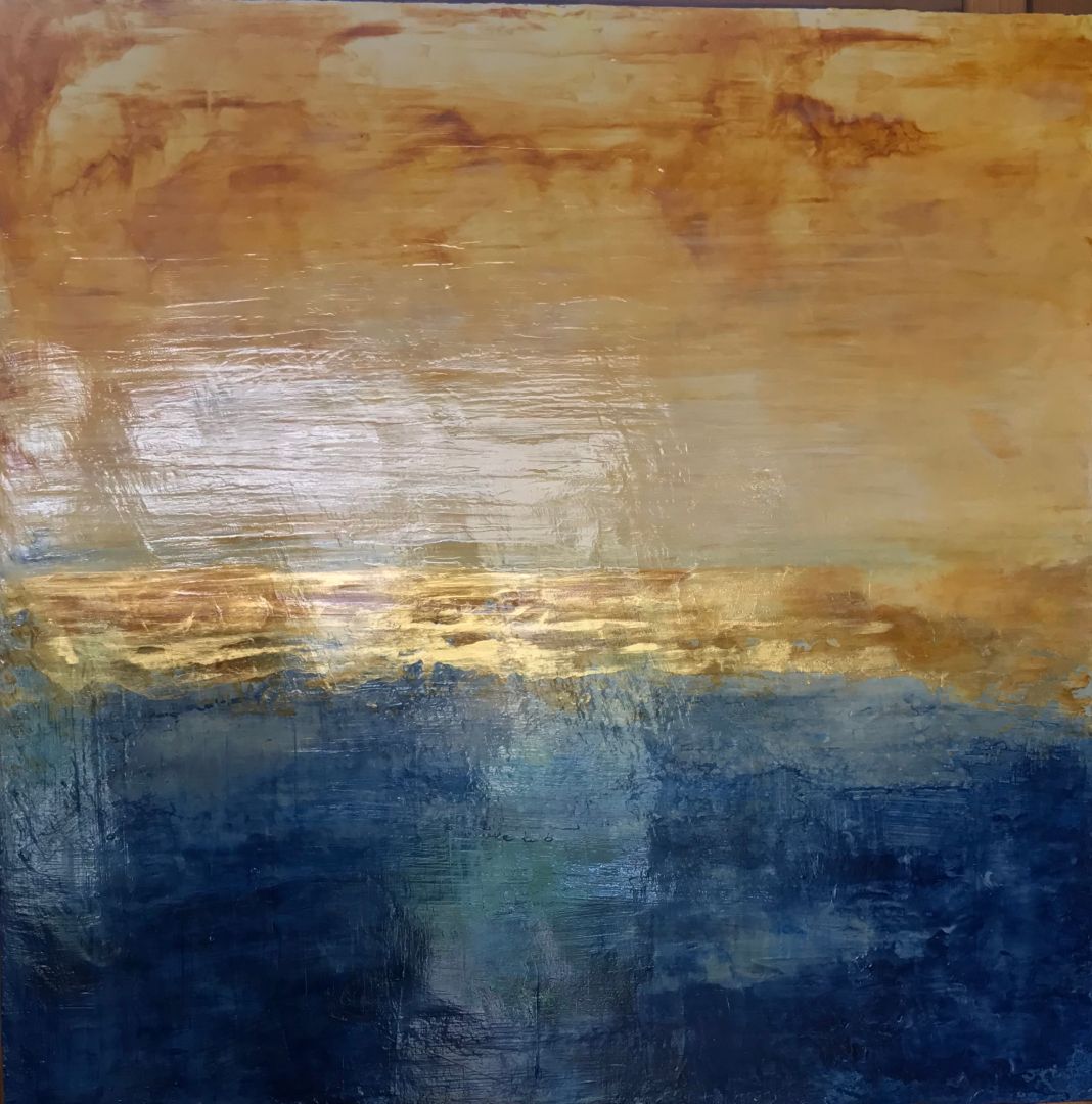 My pieces are made up of layers of acrylic paint and glaze combined to create texture and rich depths of color. The viewer instantly has an urge to touch the canvas –- to dip a finger in a pool of water or sky –- to not only see, but feel the emotion of the painting. My art is often described as luminous and lustrous, both rich and understated. I paint and glaze to create not only a profusion of color but also a bold, minimalist statement that can be stark, comforting, or electric. It gives me great pride and a deep sense of self worth and satisfaction when clients own and love pieces that I too feel the same about. To see how my art brings drama, beauty and a touch of aesthetic appeal to the environments of homes and businesses is extremely gratifying. For me, the journey has been somewhat short. I have always had a deep appreciation for art and music, but didn’t pursue these interests until I retired after a career as a Development Director for several San Diego organizations. I feel fortunate that I can devote as much or as little time now in my retirement years to this wonderful endeavor. My art studio, located in my backyard is truly a sanctuary of all things I love…art, music, garden, fountain, light, the smell of wood, and a place to write a quick personal note and yes, even pay bills.