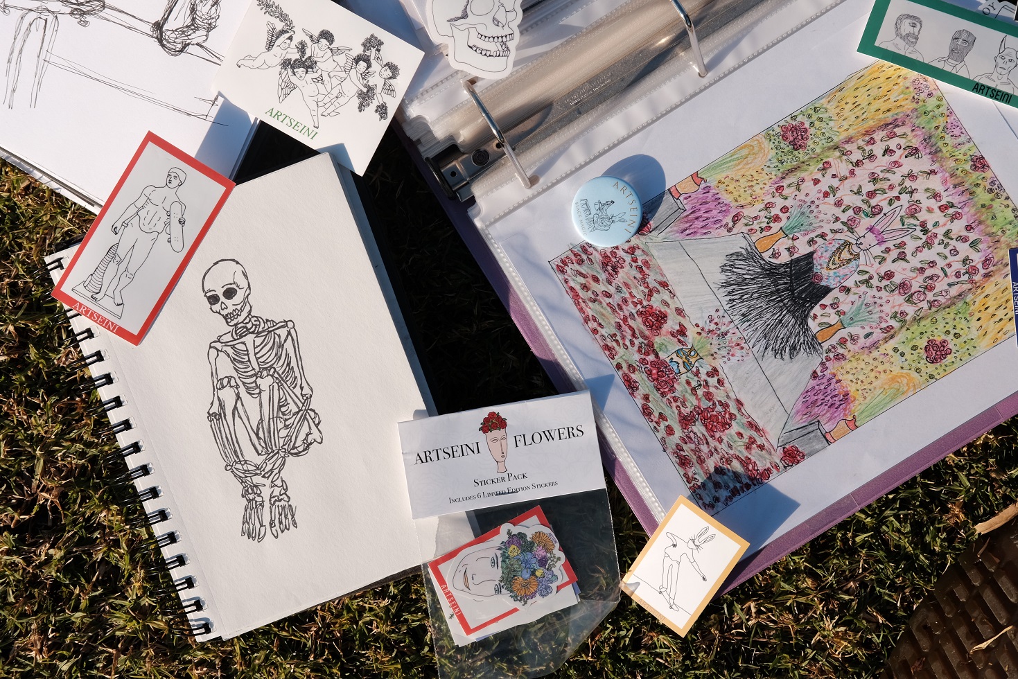 I have this obsession with rabbits, flowers, skeletons and drawing things from art history in my own version. Usually I read about art history to get inspired from others, or I just start sketching a lot and pick ideas out. My work is made of many mediums such as ink, color pencil, oil pastel, acrylic, crayon and basically anything I can get my hands on. From there I scan the drawings and I get to decide what I want do with it like put it on clothing for my company ARTSEINI, paint it on a big canvas, or make a sculpture from it. To get to where I am today it took a lot of repetition, trial in error, and patience. I had to figure out what people liked the most when buying my clothes/art. I do all the designs myself so it can be hard coming up with ideas to put on clothing or it’s hard to pick out from the millions of ideas that I have. Over the years I’ve also been practicing how to draw better and develop my own style. I also attended Fullerton Junior College where the art department has one of the greatest professors and they all taught me something to improve my designs and just how draw effortlessly and have fun. I always made art all my life but learning the technicality and history of it really improved my designs, and gave me more inspiration over the years from when I started in 2016. Just this year I feel like everything is finally coming together for my brand. I feel like I had to stop being so tedious about designs, use new mediums, experiment more, take bigger risk! Like I tell everyone I like art and clothes, so I just put them together.