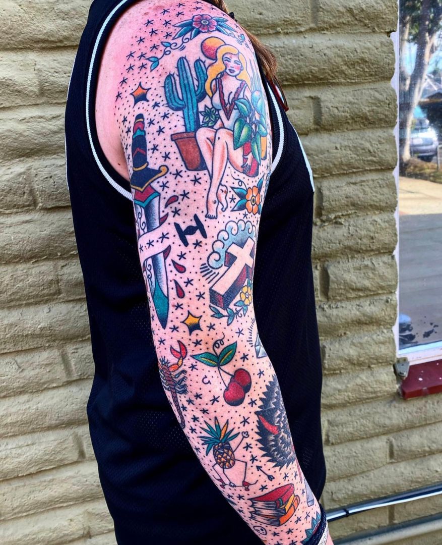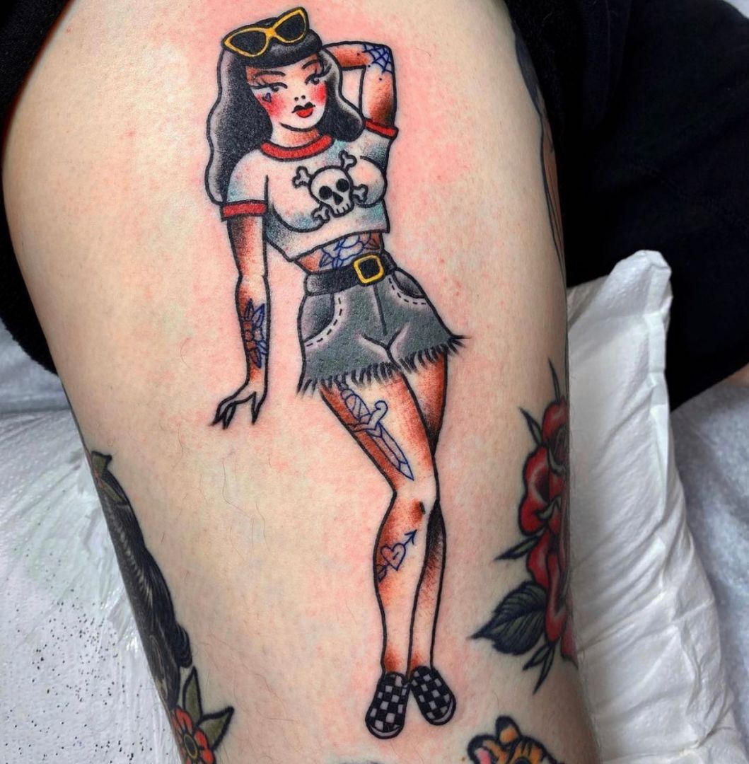 I am most proud of how far I’ve come in my career. There weren’t a lot of women tattooing when I began my apprentice in 2002 and I wasn’t exactly sure of what my tattooing “style” was but I loved traditional tattoos and how timeless they were. For many years I just did what clients wanted without putting my own spin on it but was always thrilled when someone would say they saw a tattoo and knew that I had done it. I had slowly come into my style without even knowing it and it felt good.