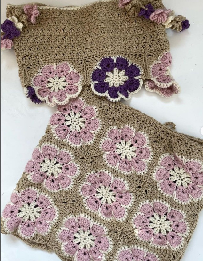 Top & Skirt Pattern: @_gabrielsyarns Flower Scrunchie: @crat3dbyt Youtube Tutorial Waffle Vest Pattern: @craf3dbyt Pink Hat Pattern: @georgiacleggdesigns Button up top: @Jacqofyarns, @thewendy28
