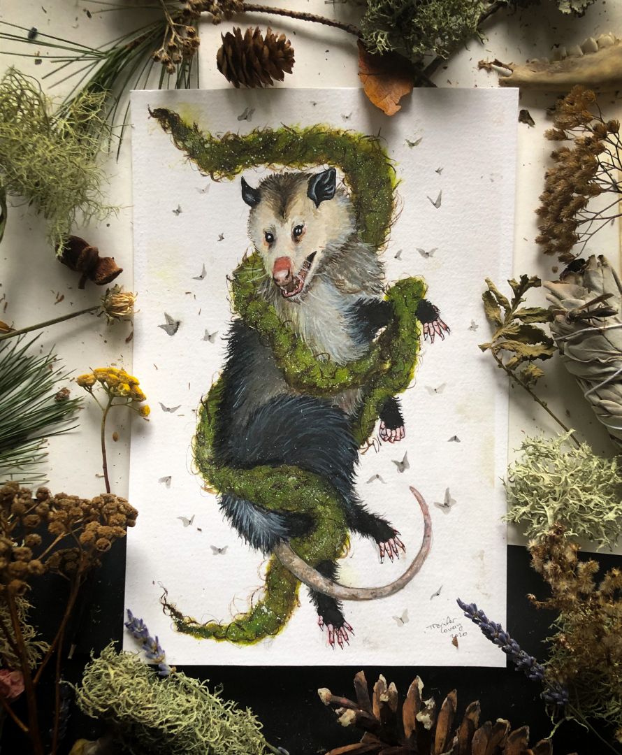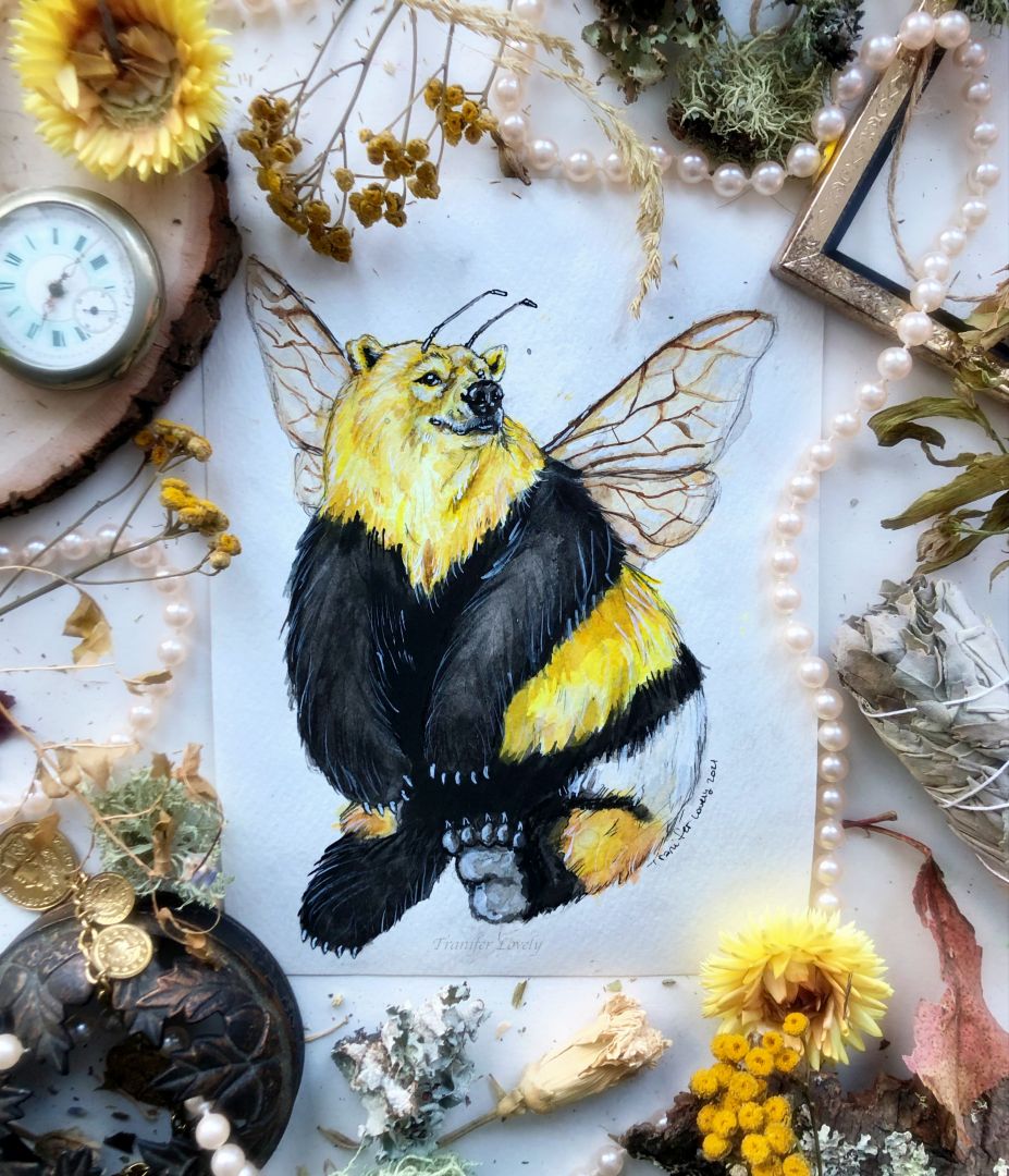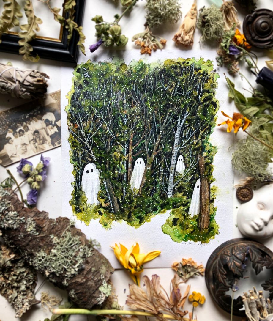 I work primarily in watercolors, with a bit on pen and ink thrown into the mix. I like to take the nature I am surrounded by every day, and give it a bit of a whimsical twist. I love creating landscapes with ghosts, flora and fauna defying gravity and floating together in aesthetic harmony, tiny patches of earth with tiny creatures hiding inside the moss, and even some more playful pieces, like a bear mixed with a bumblebee, or an opossum with fairy wings. I like to paint my own interests, while still to create something that appeals to my customers and collectors. I always enjoy coming up with new ideas, and I have a huge pile of sketchbooks full of ideas just screaming to be painted. I have more ideas than my two hands can keep up with, and not enough hours in the day.