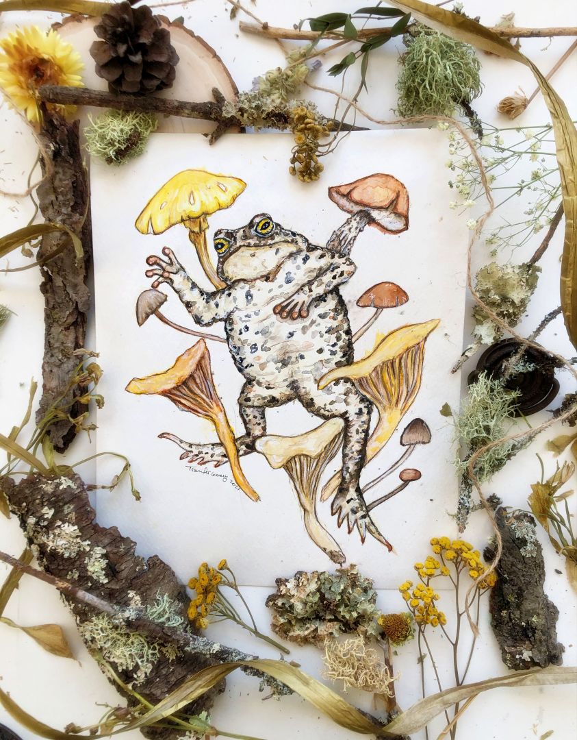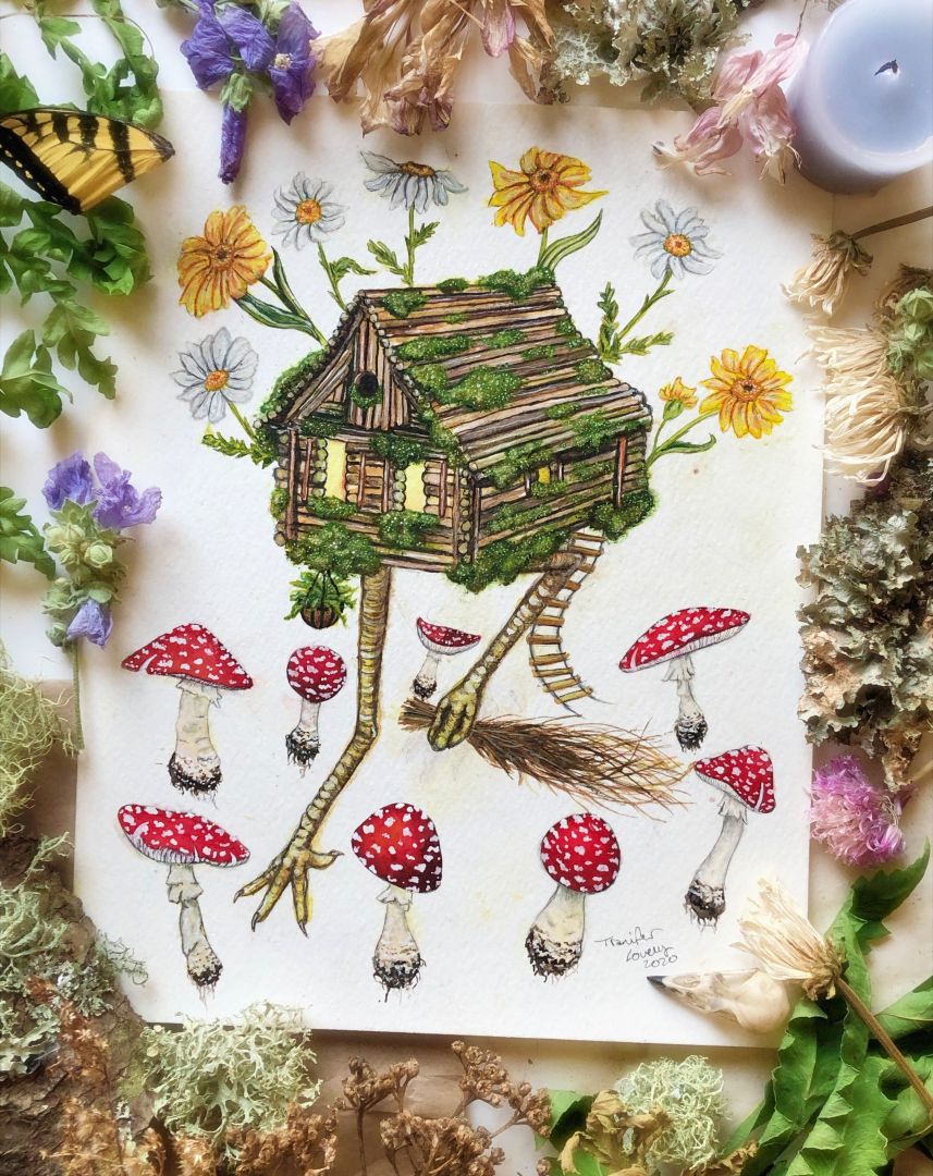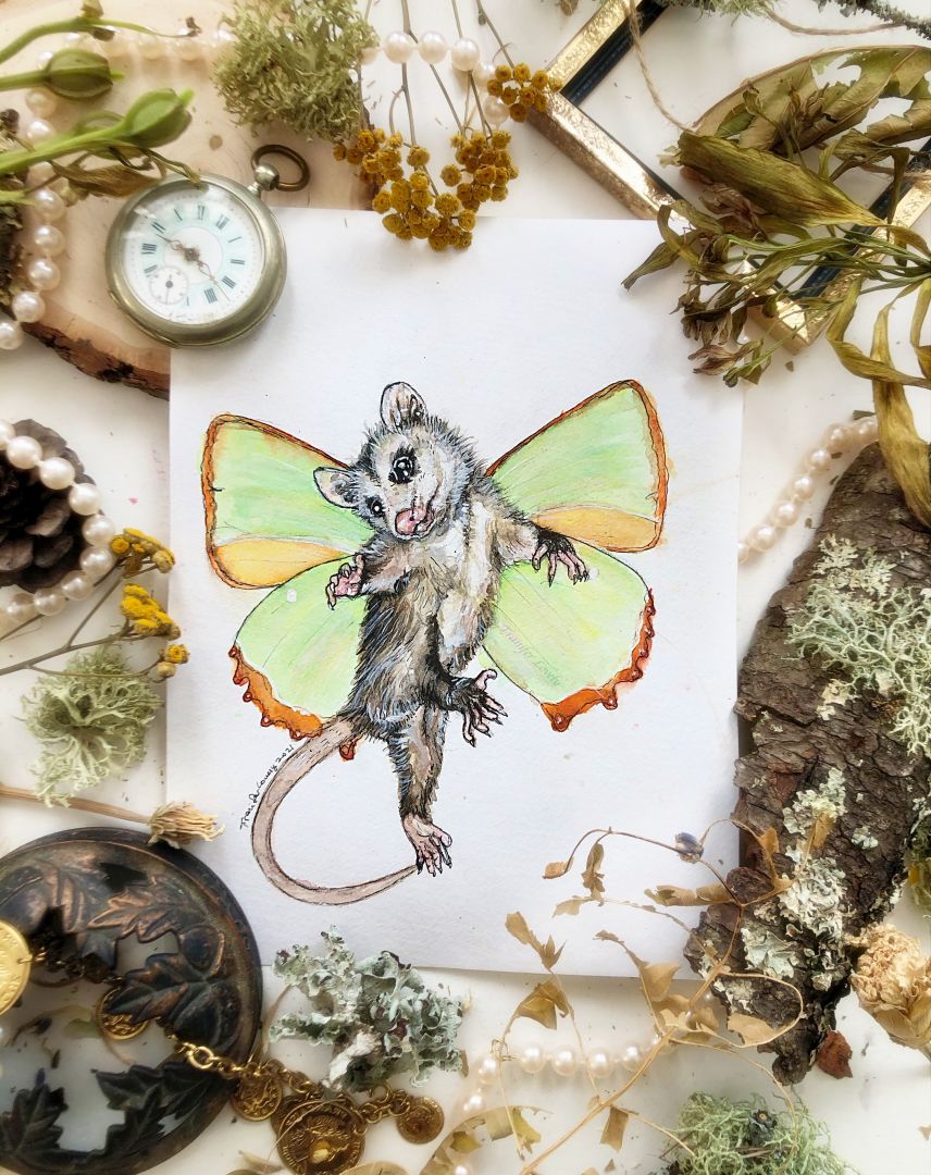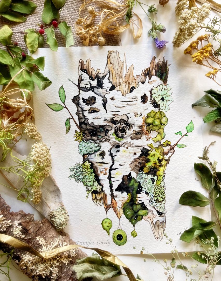I work primarily in watercolors, with a bit on pen and ink thrown into the mix. I like to take the nature I am surrounded by every day, and give it a bit of a whimsical twist. I love creating landscapes with ghosts, flora and fauna defying gravity and floating together in aesthetic harmony, tiny patches of earth with tiny creatures hiding inside the moss, and even some more playful pieces, like a bear mixed with a bumblebee, or an opossum with fairy wings. I like to paint my own interests, while still to create something that appeals to my customers and collectors. I always enjoy coming up with new ideas, and I have a huge pile of sketchbooks full of ideas just screaming to be painted. I have more ideas than my two hands can keep up with, and not enough hours in the day.