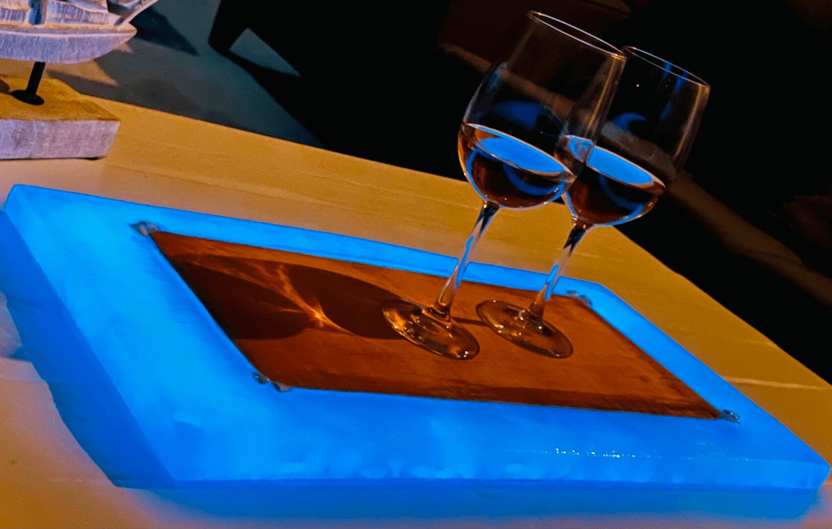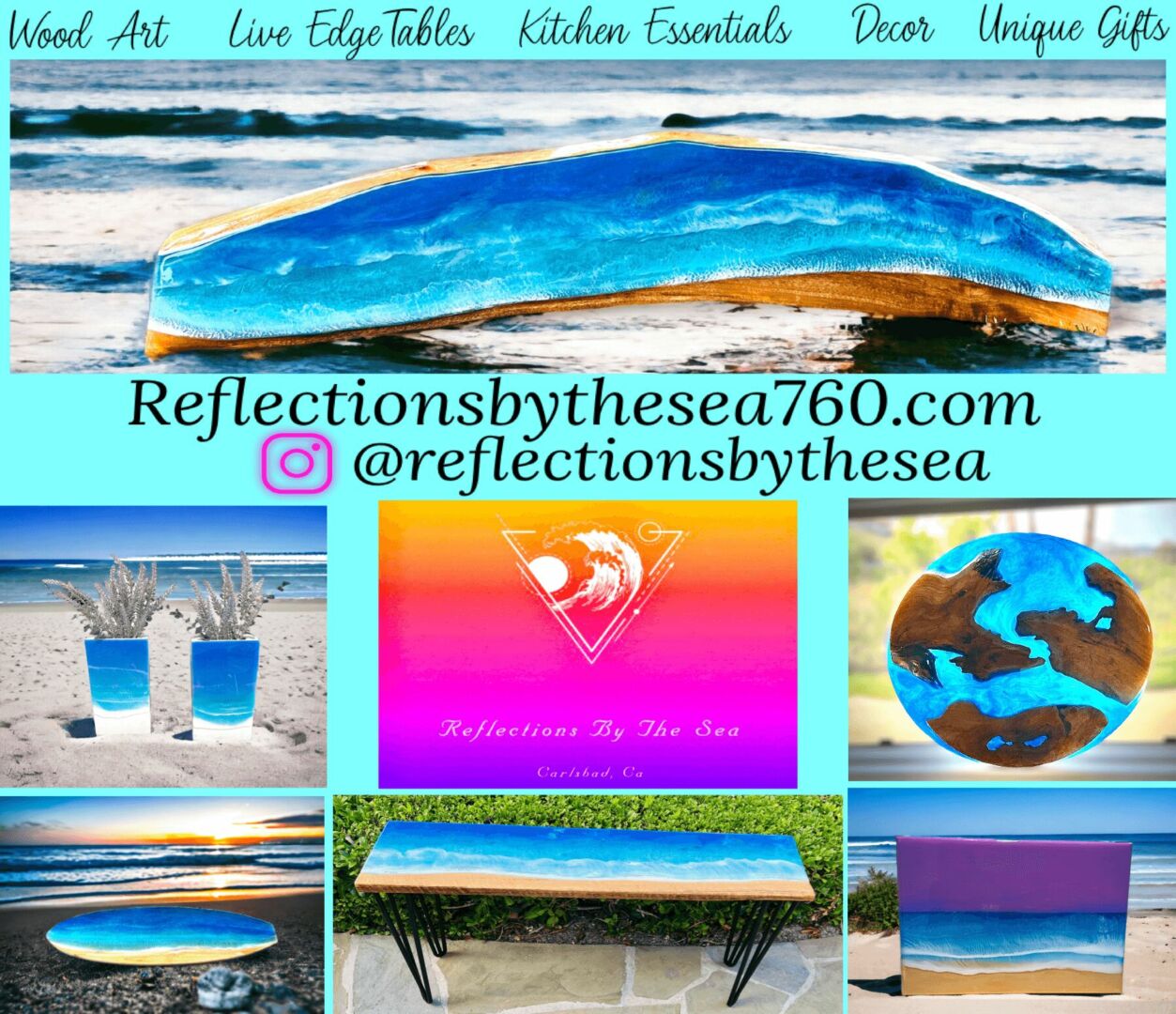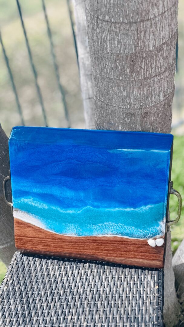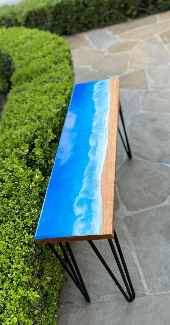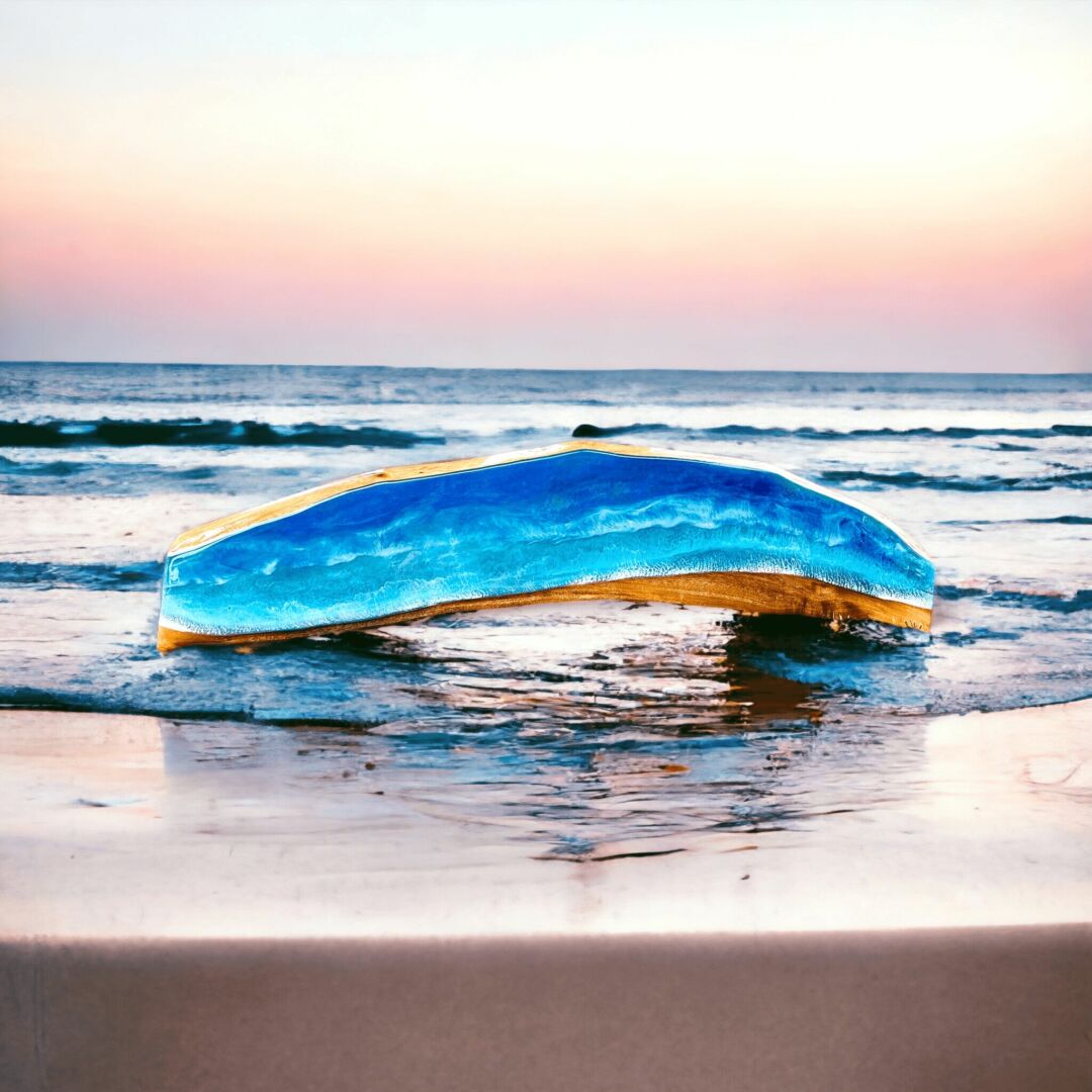 I became an esthetician at age 21 and loved helping other’s achieve their skin goals. I realized that make-up was a big reason why many were having skin issues so I became a make-up artist. I worked closely with companies that shared my same passion of helping others look and feel their best. I then became a make-up artist for the stars on varies tv shows and movies. Fast forward 10 yrs, married with three boys, I knew that kind of work was just not going to be possible anymore but once an artist always an artist. I began painting on canvases instead of faces and exploring other mediums! I loved the way that Epoxy looked on beautiful pieces of wood so I dove right in and the response I received after just a few pieces, I realized this was my new path in helping others heal and reach their true potential. My art pieces are very unique to our beach town we call home, Carlsbad. I started making tables with oceans scene using epoxy, it became very therapeutic for me and for those that buy my art. I wanted to make sure that even in the dark that my art pieces can still inspire, comfort those around it so every piece glows in the dark! It becomes a whole new piece of art to look at, like bioluminescent waves crashing on the beach. My hope is that my art reminds you that you are enough, you do matter and you can do anything you put your mind too!