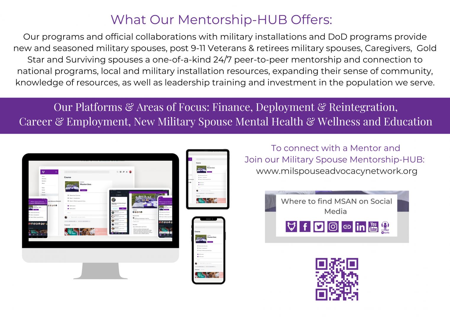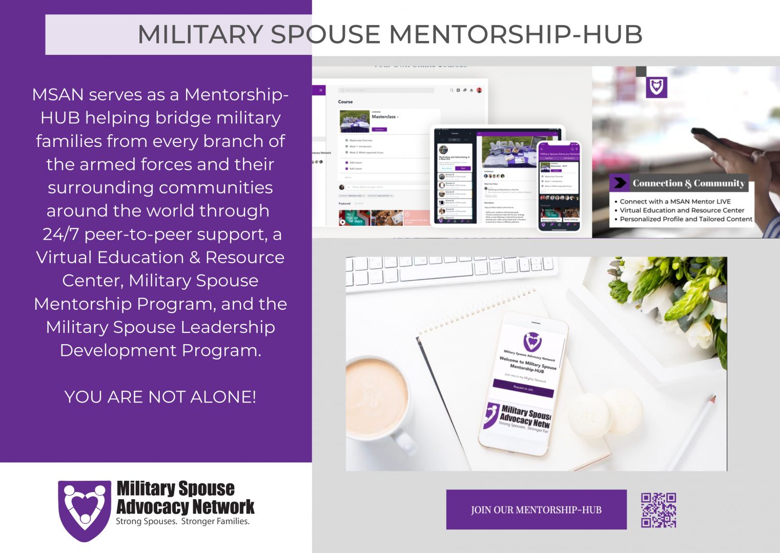 MSAN’s Military Spouse Mentorship-HUB helps to bridge military families from every branch of the armed forces and their surrounding communities in locations around the world through a Virtual Education and Resource Center, New Military Spouse Support Program, and Leadership Development Program.