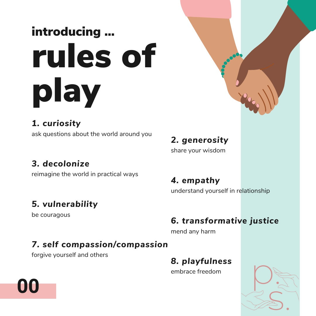 I try to abide by what I call the “rules of play;” eight trauma-informed guidelines created to empower us through community. The most important one, encompassing all the others, is Rule #6 “Mend any harm through transformative justice.” This rule requires that we engage in our relationships with vulnerability, empathy, accountability, and curiosity. We all harm each other–it’s an inevitable part of humanness–straining and sometimes even severing our relationships. But if we approach these moments intending to “mend any harm,” our vulnerability can lead to empathy and invite us to accept accountability for our actions. Then, as a community, curiosity can guide us to transform our behavior so that everyone is honored. This applies to intimate conflicts and societal ones. The attitude to “mend any harm” guides us to restructure our world and the way we see it from something violently unequal to something lovingly shared. It’s easy for us to be complacent when we don’t empathize with the people around us. It’s hard to let go of privileges that benefit us at the expense of others. But, transformative justice understands that as we harm others, we also harm ourselves through ruptured relationships. This is my invitation to all of us: Let’s hold ourselves accountable to one another. Let’s speak bravely when we experience or witness harm. Let’s honor our relationship with one another by listening deeply, learning humbly, and acting with compassion. Let’s welcome correction with grace and correct others in love. Let’s mend any harm we cause to the best of our abilities. Let’s be flexible, open, and willing to change. Let’s flatten hierarchies and redistribute power with the knowledge that until all of us are free, none of us are free.